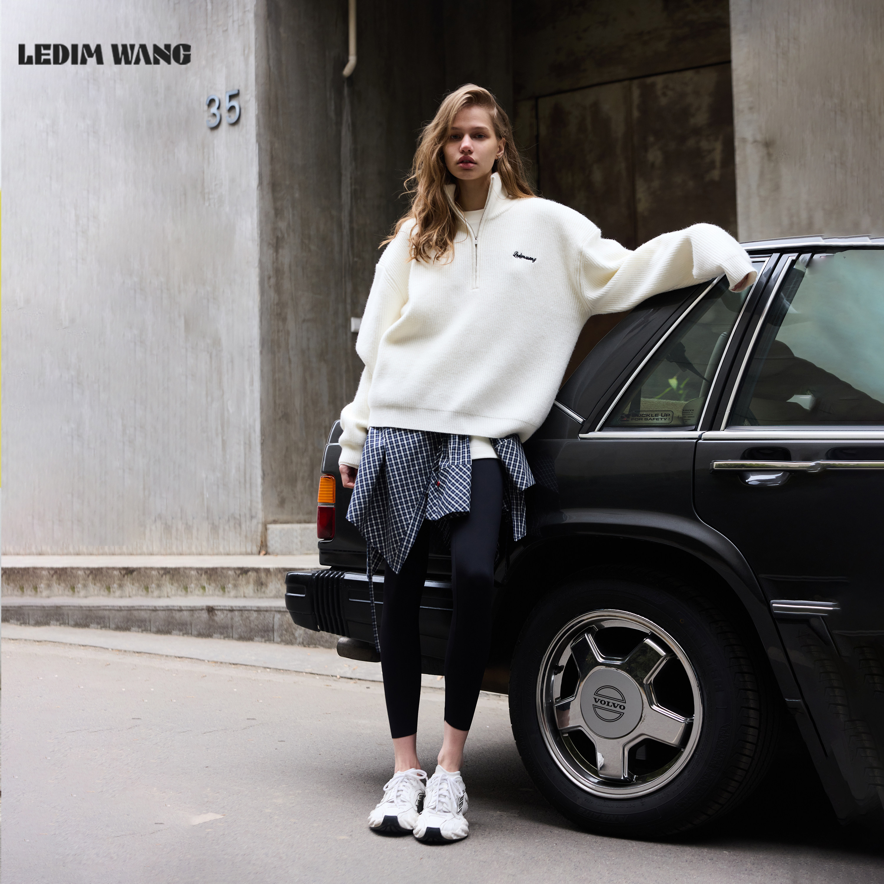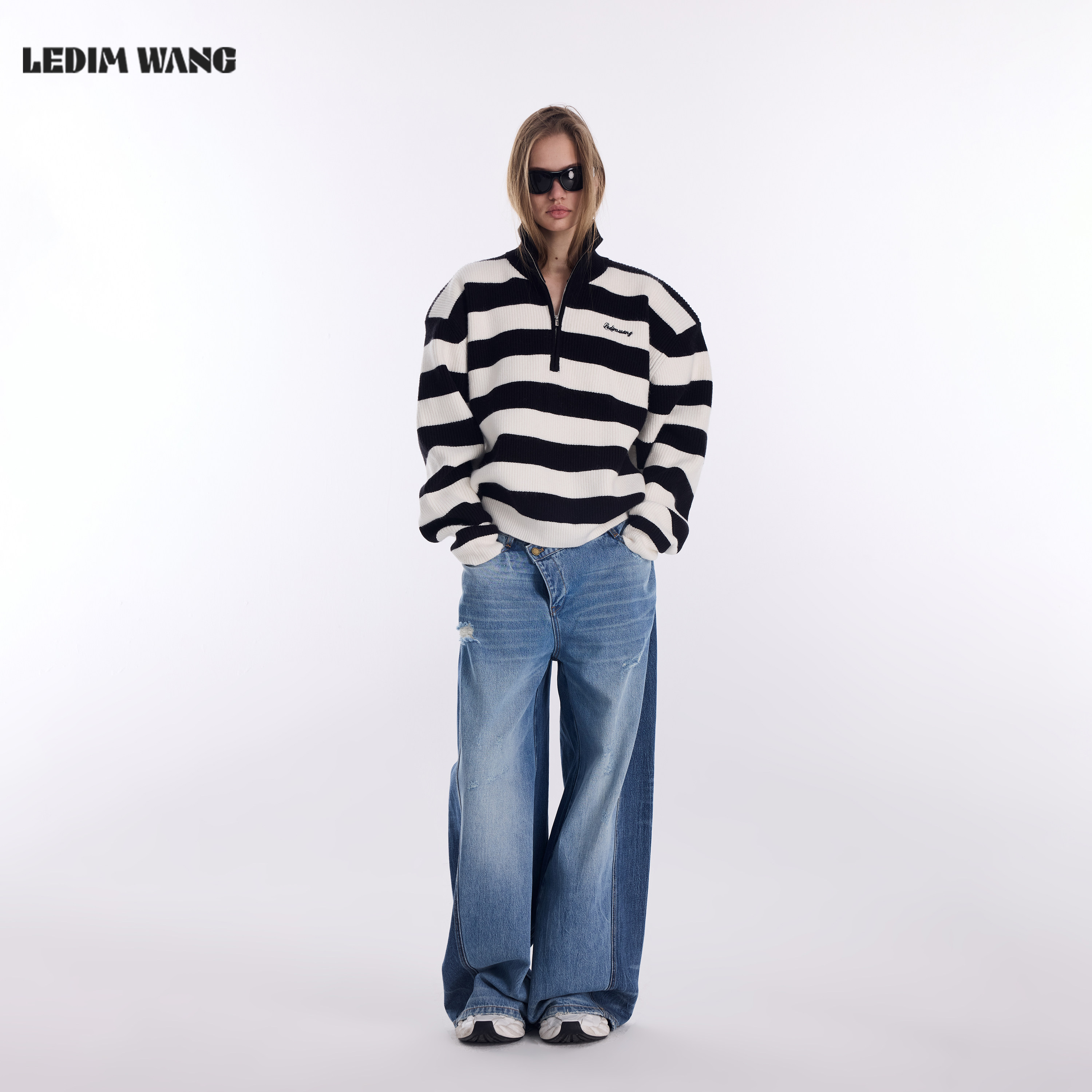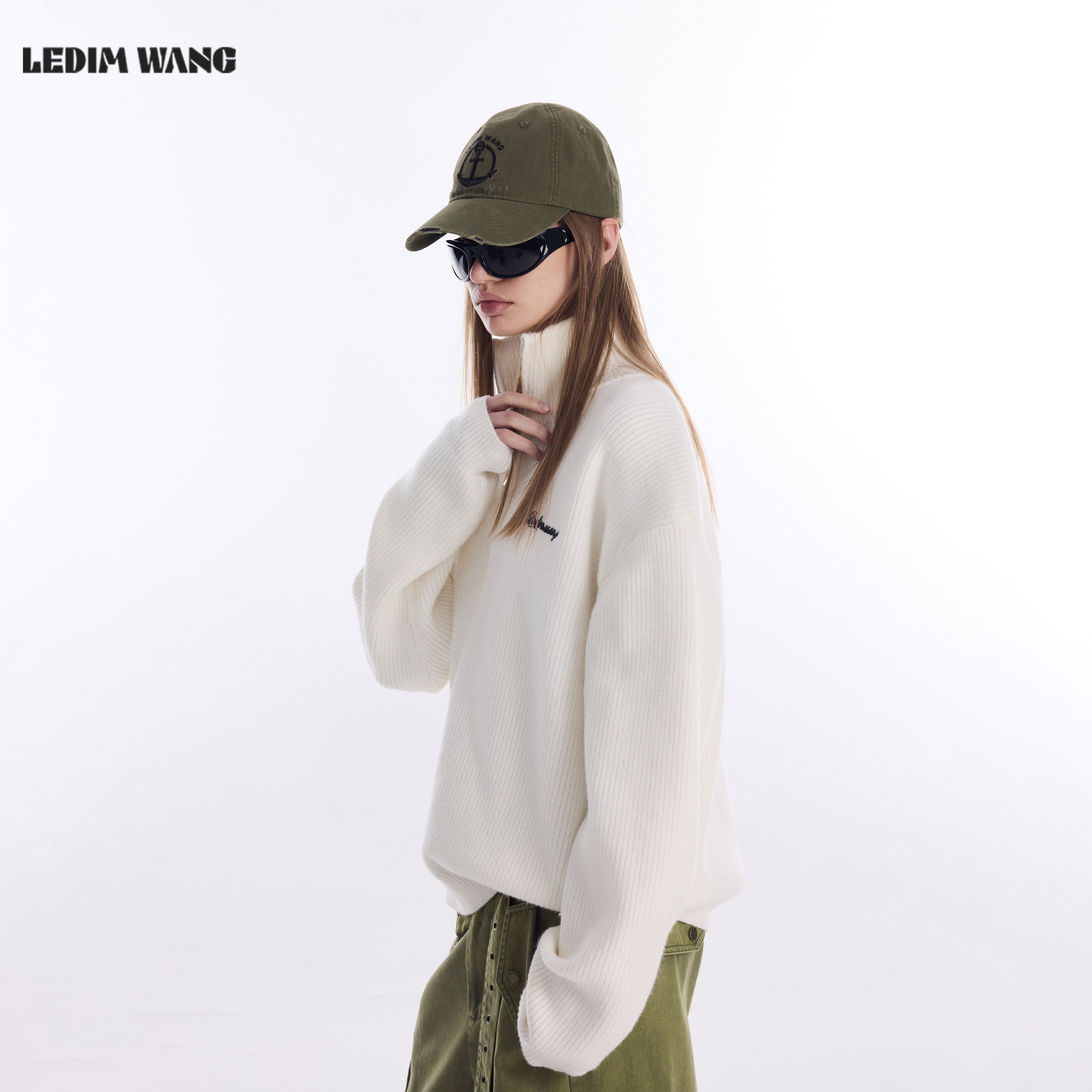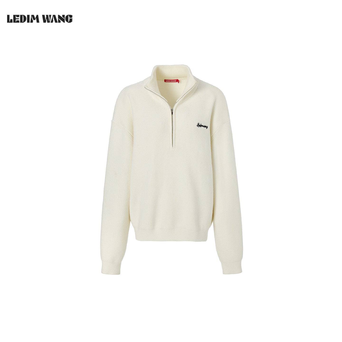 LEDIM WANG立领毛衣女2026春季新款白色拉链垫肩T型亲肤套头上衣