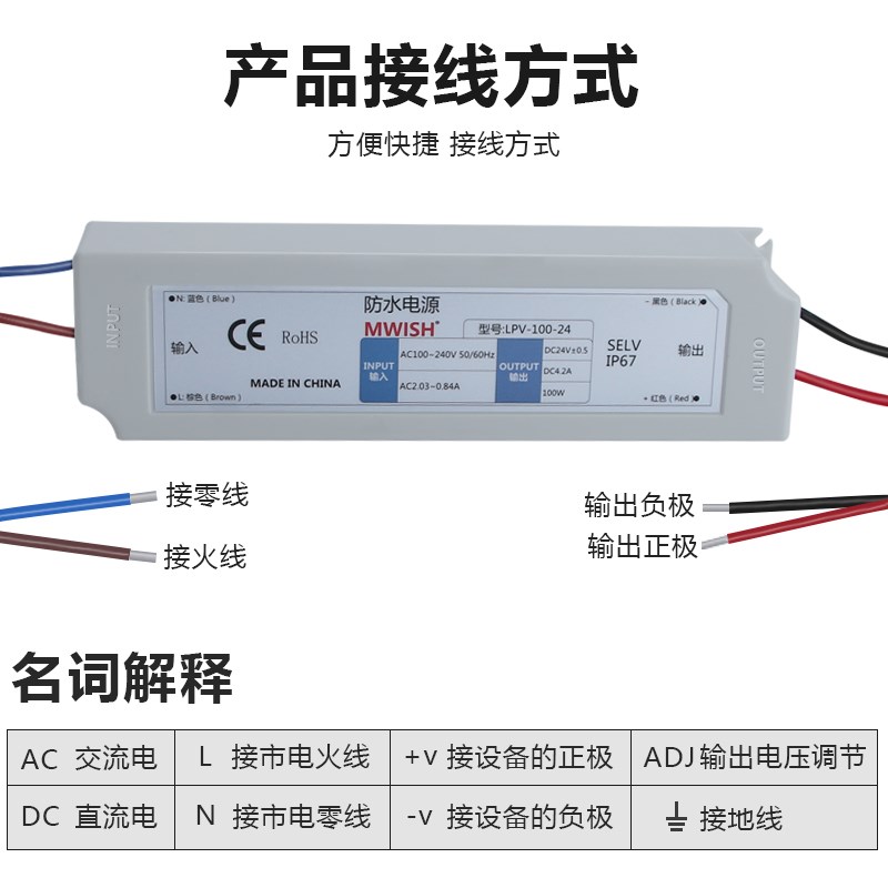 明纬LPV-100-24V/12V防水开关电源220直流防雨户外变压器驱动模块
