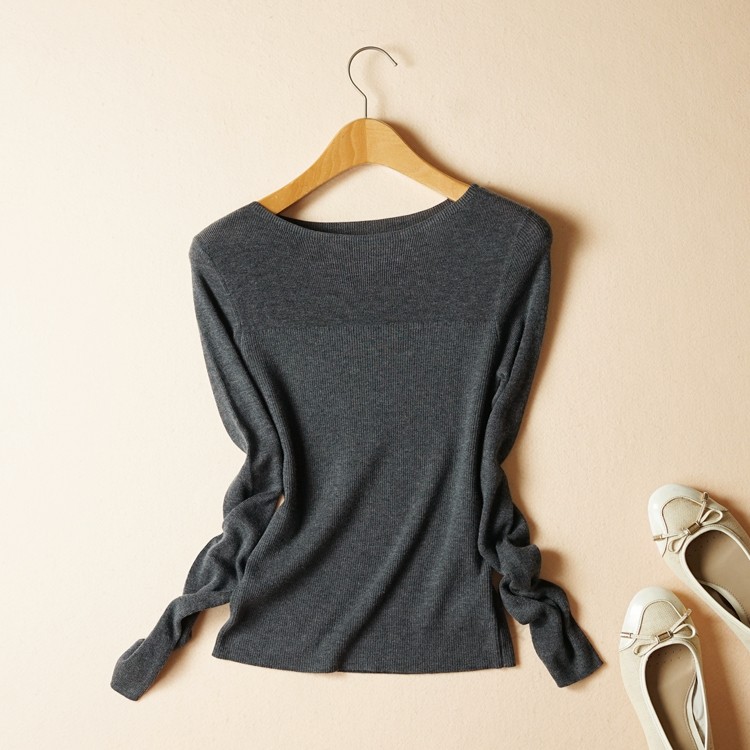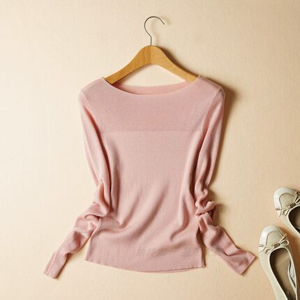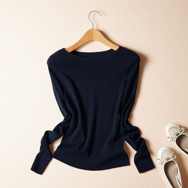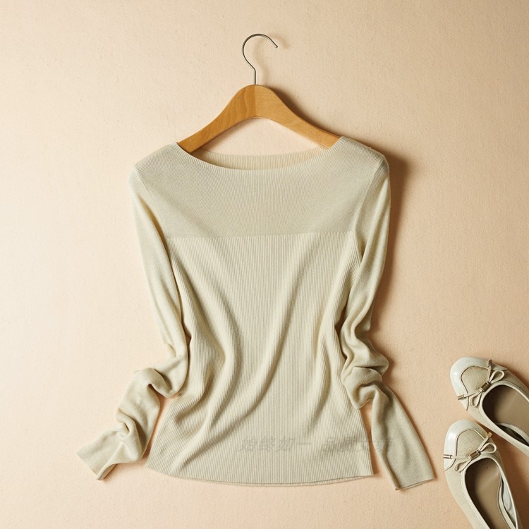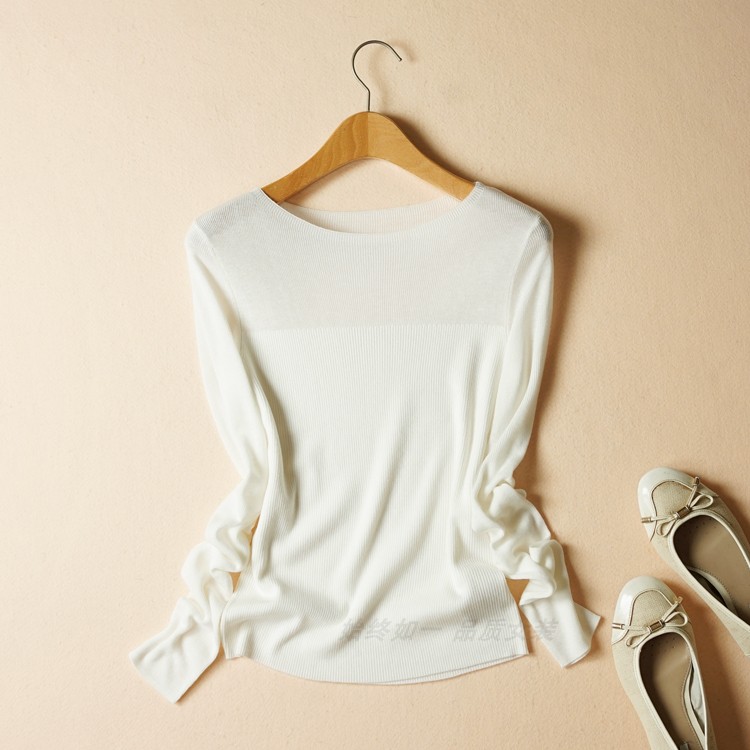 2025春秋新款 微透拼接一字领薄款修身针织打底衫上衣内搭毛衣女