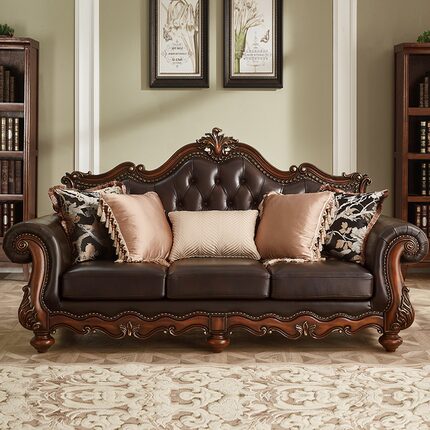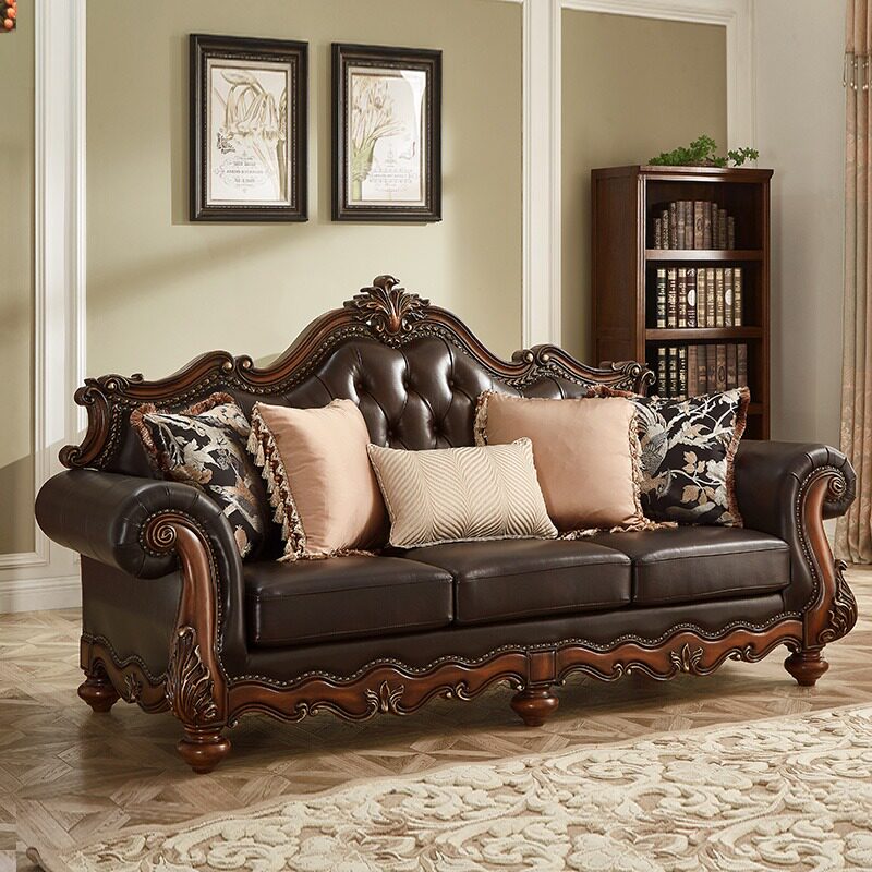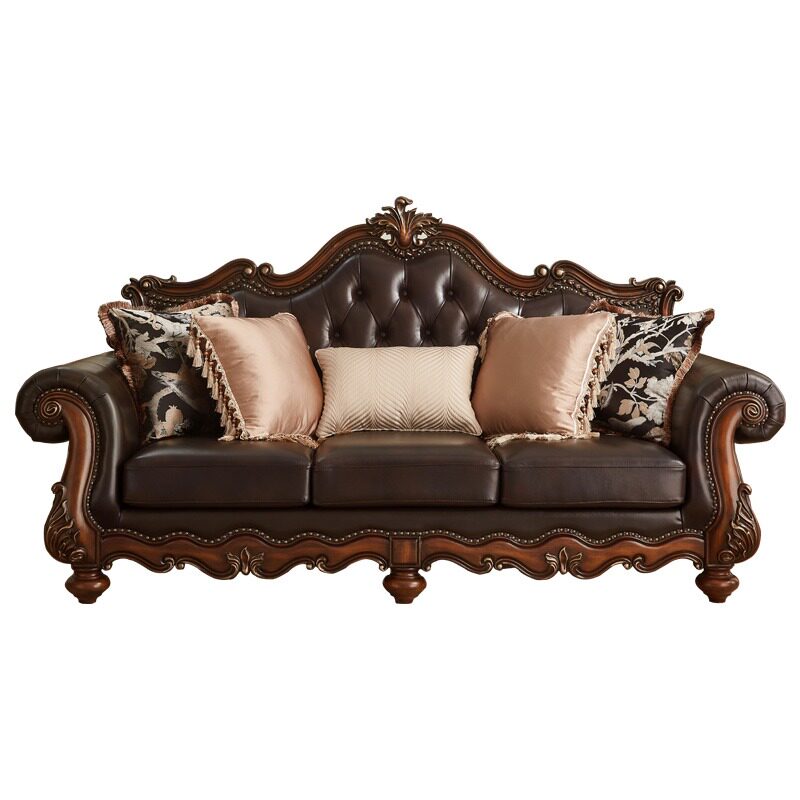 美式古典实木沙发三人位雕花皮艺客厅家具深色储物沙发