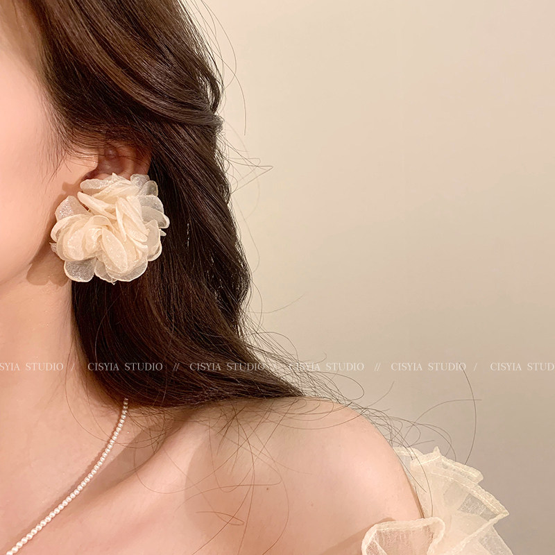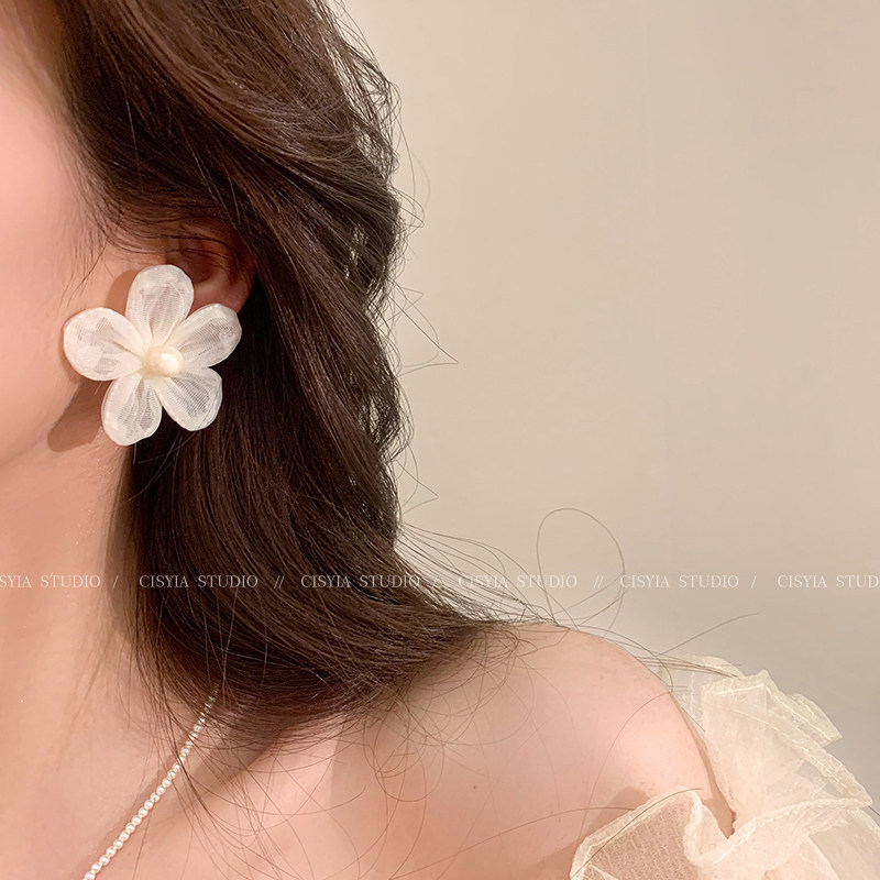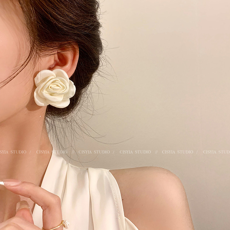 氛围感布艺花朵耳环女白色简约百搭气质耳钉2025新款爆款春天耳饰