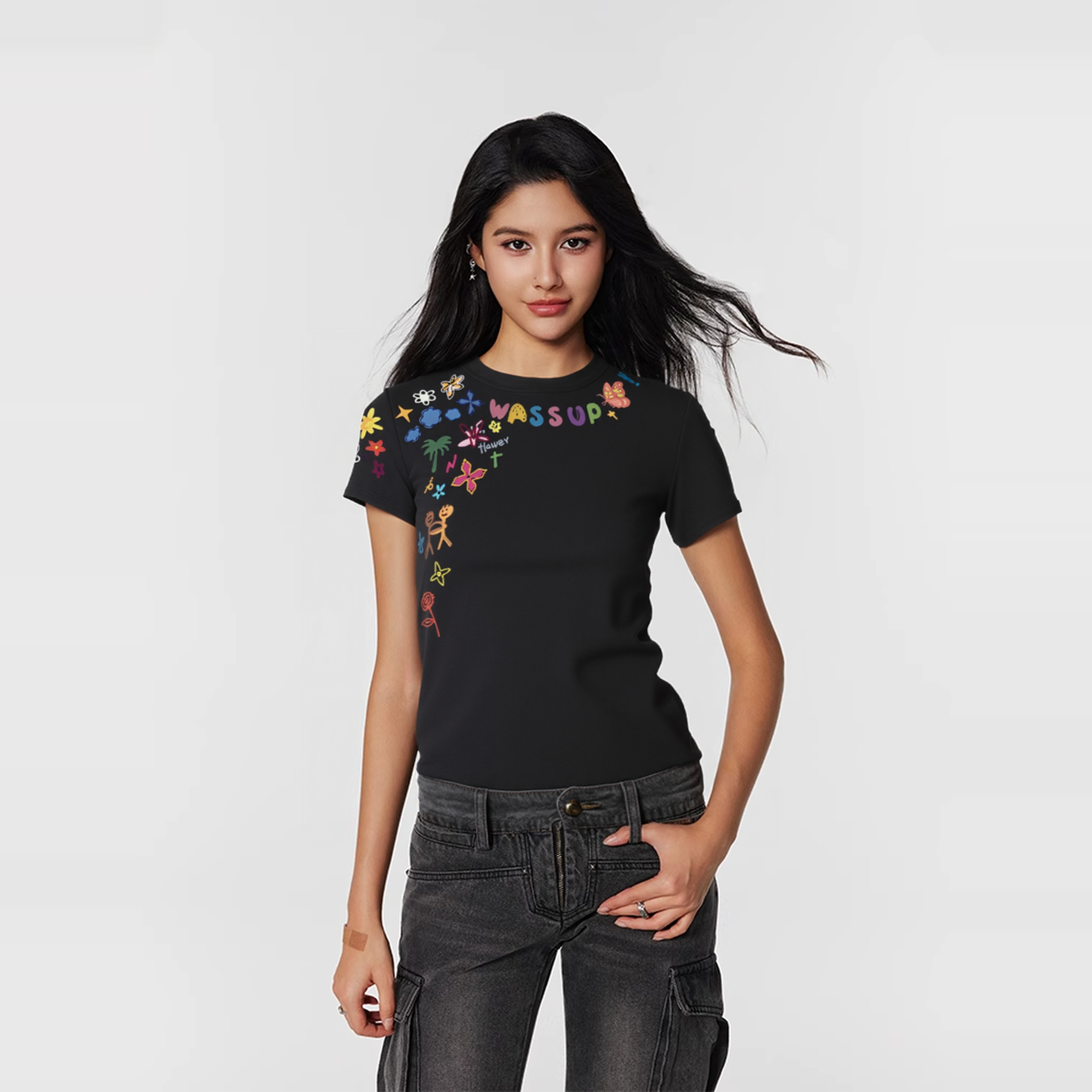WASSUP正肩短袖女2025夏季新款白色修身t恤显瘦内搭纯棉打底上衣