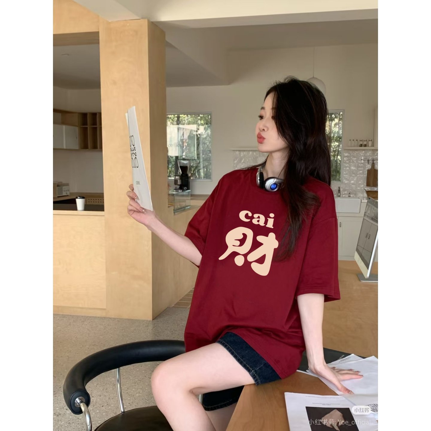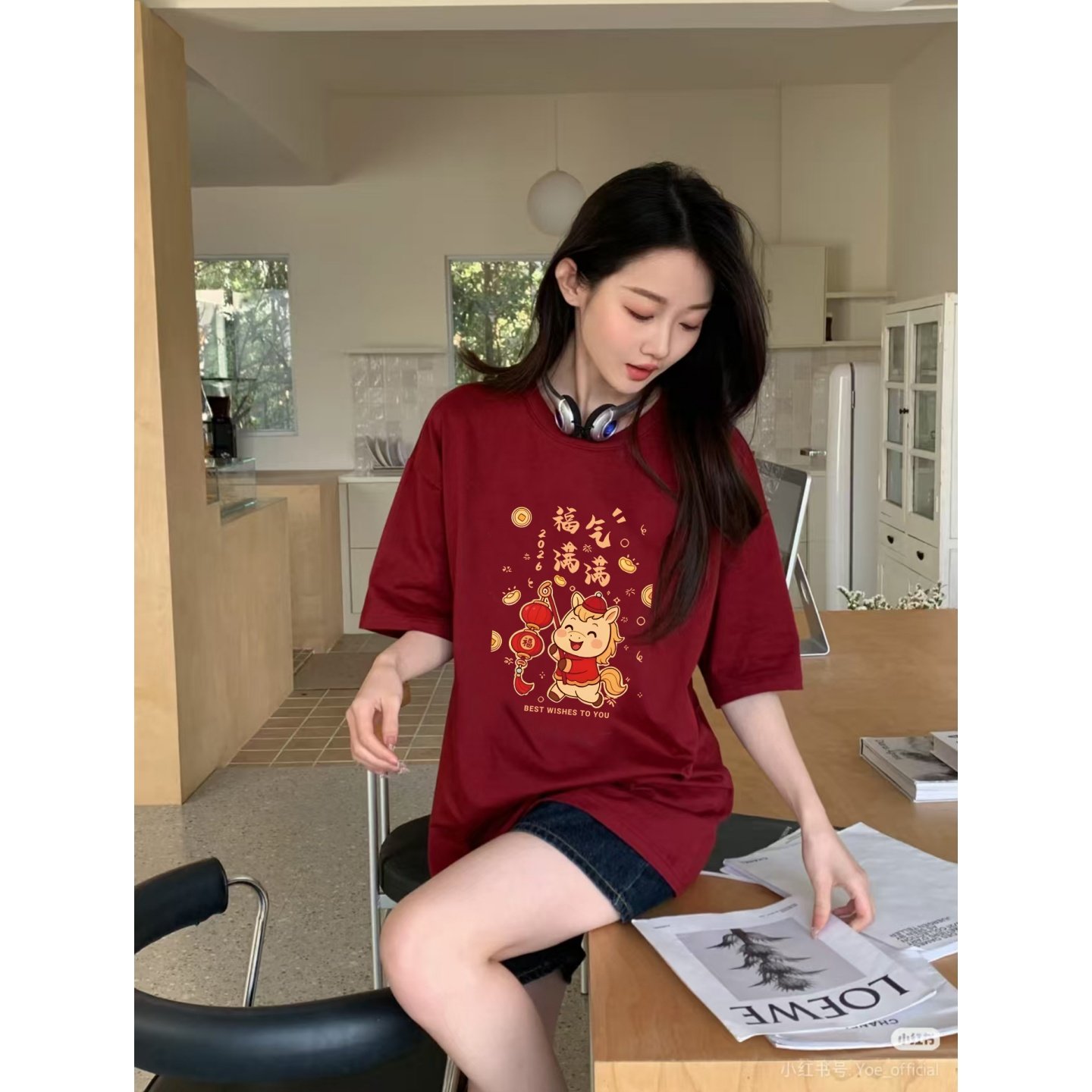 2026本命年酒红色短袖t恤女宽松大码纯棉印花中长款显瘦新年上衣