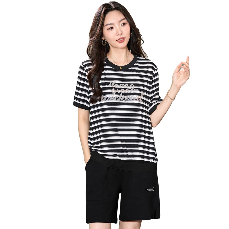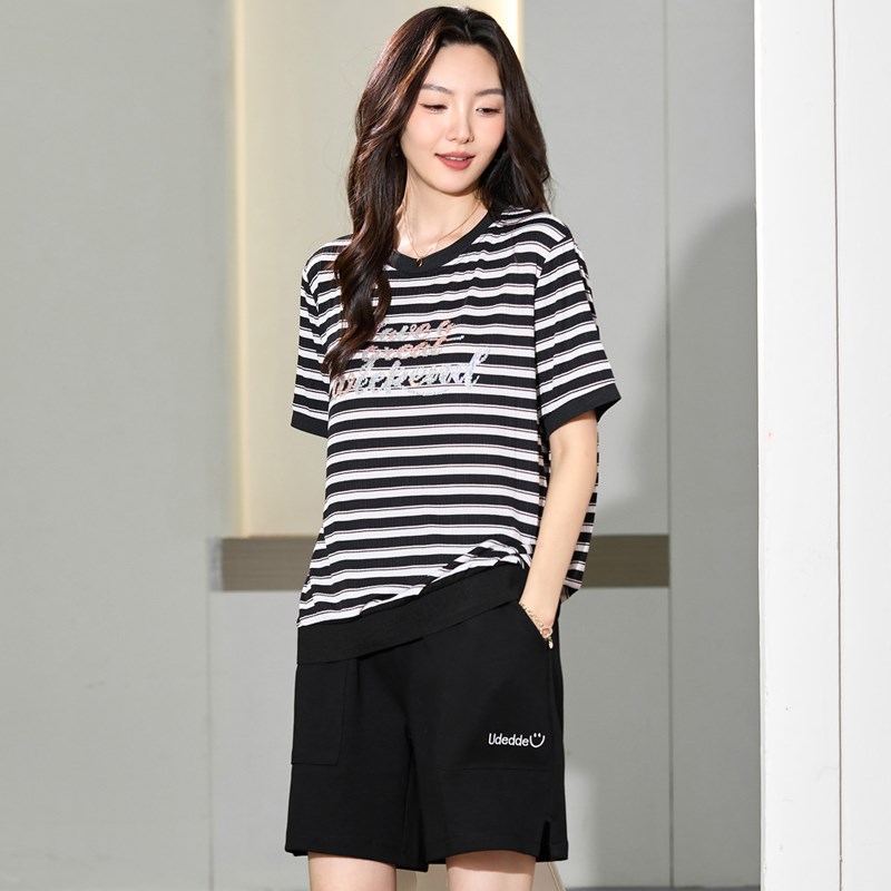 大码女装胖mm时尚洋气条纹T恤衫200斤胖妹妹夏装宽松显瘦休闲上衣