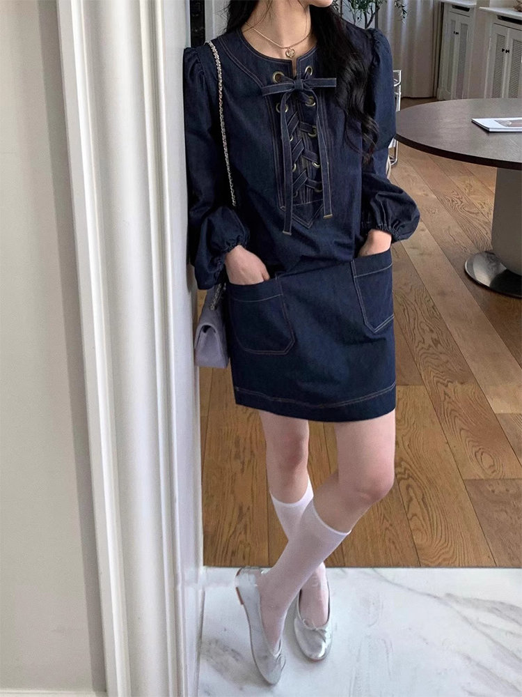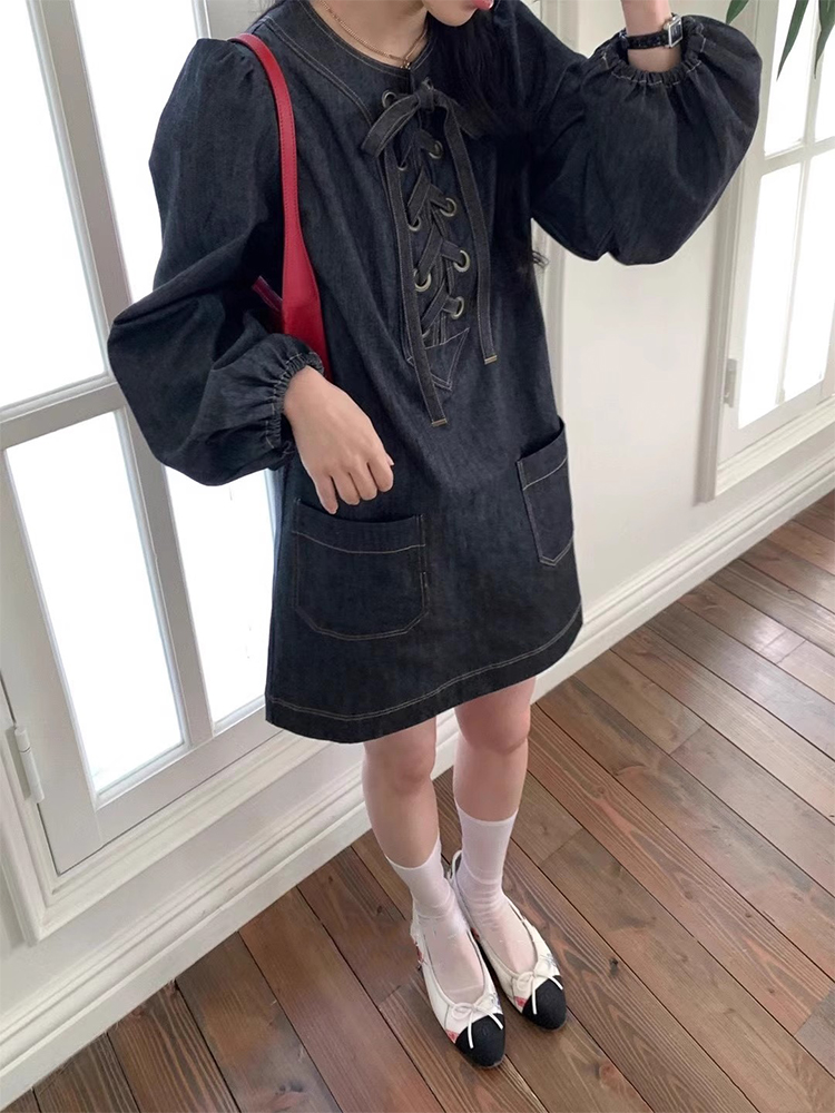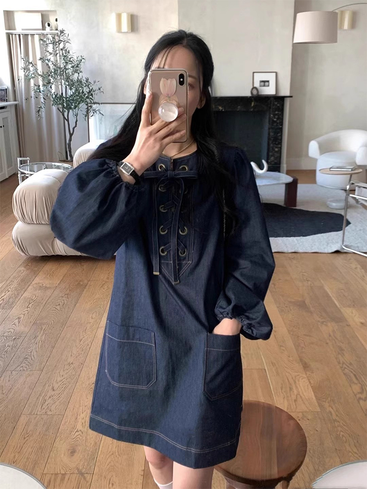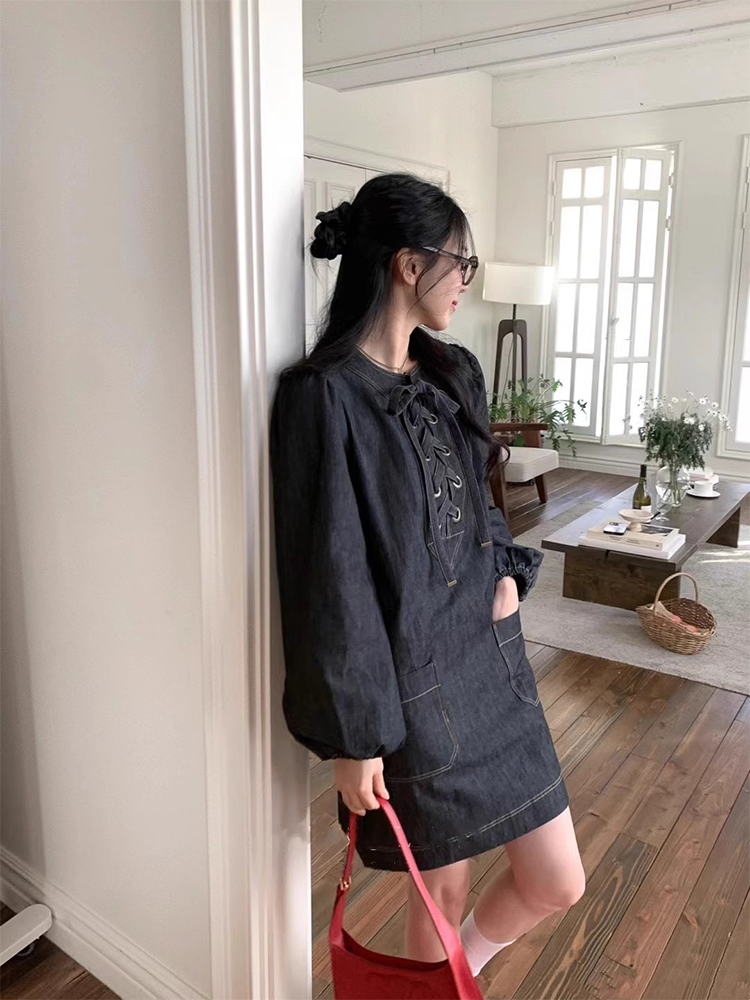 韩国chic春季小众设计交叉绑带明线牛仔连衣裙女宽松灯笼袖短裙子
