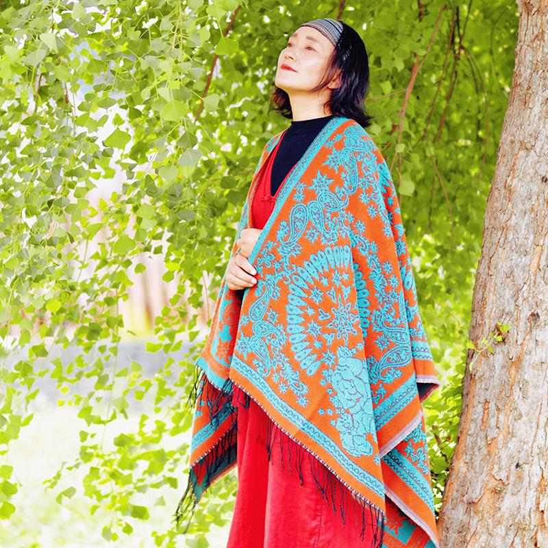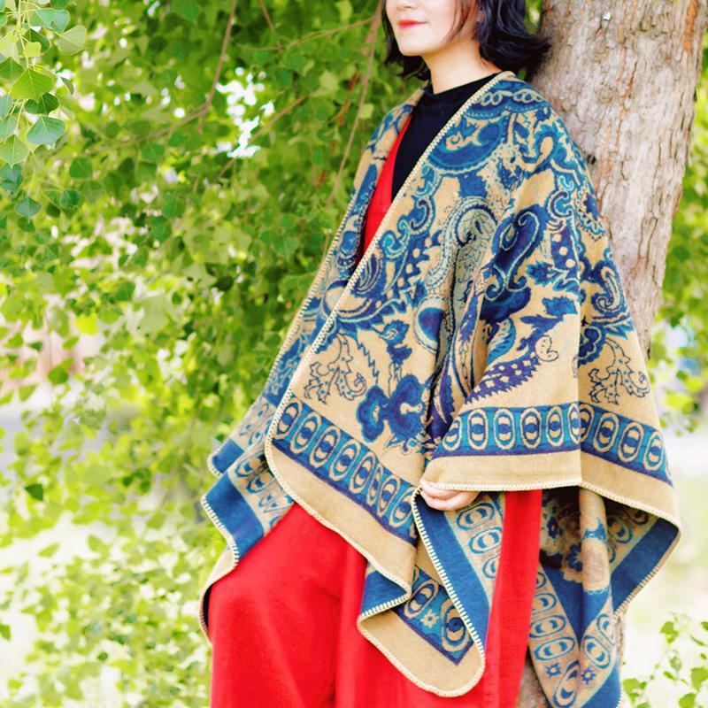 2025秋冬民族风双面围巾披巾旅游拍照保暖开叉披肩斗篷两用女