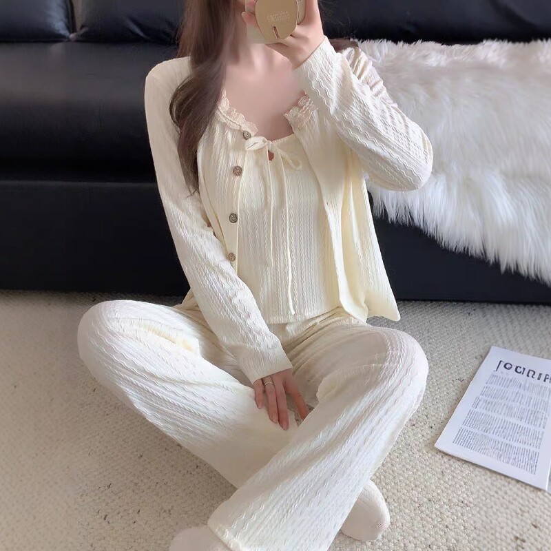 性感杏色纯棉睡衣女款春秋季2025新款带胸垫一体吊带长袖三件套装