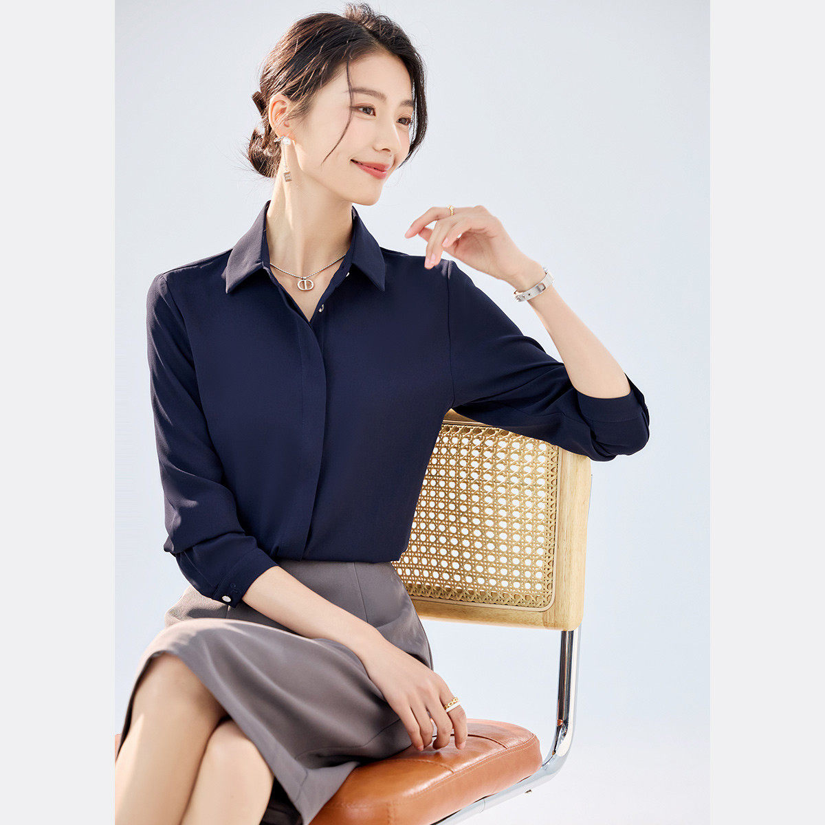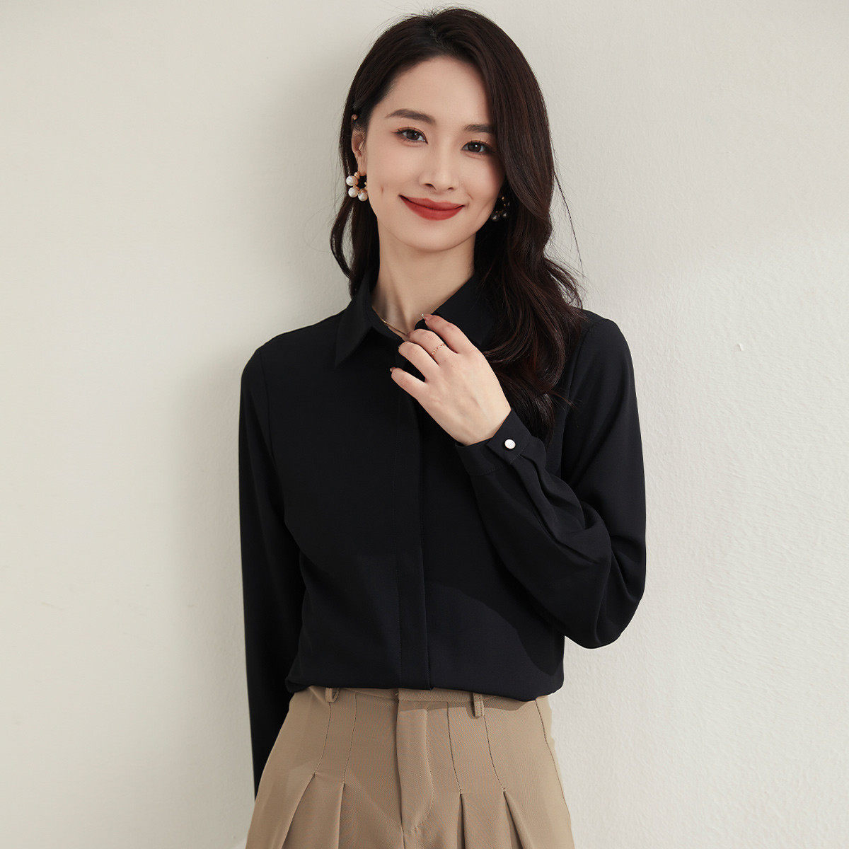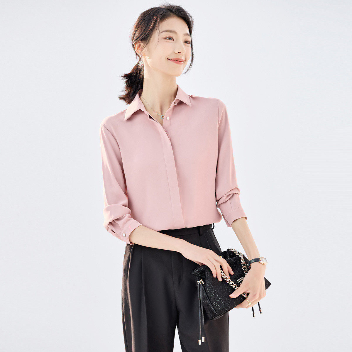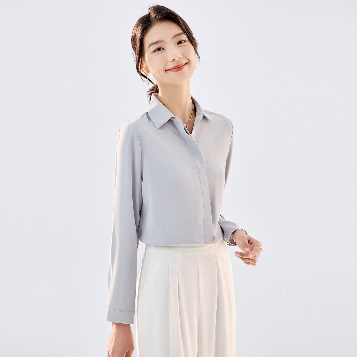 罗蒙春秋雪纺衫女士长袖衬衫翻领暗门襟正装职业通勤上班白衬衣女