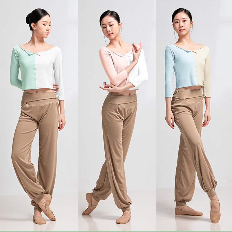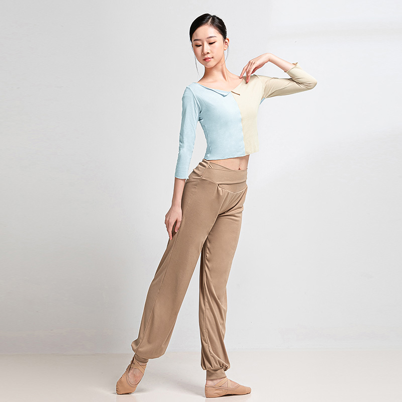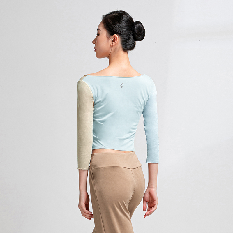 sansha 三沙现代舞服女 瑜伽舞蹈修身上衣短款七分袖撞色练功服