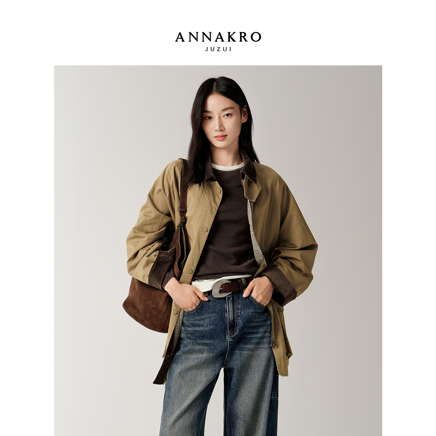 玖姿安娜蔻巴恩风美式工装拼接翻领中长风衣外套女2025秋季新款