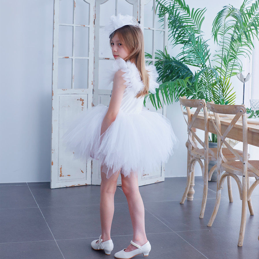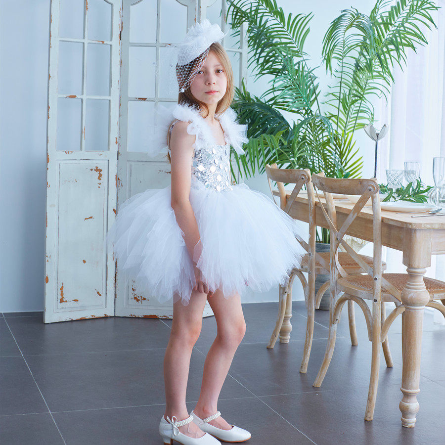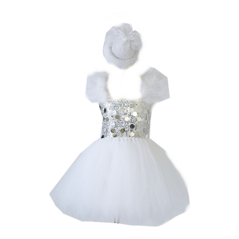 儿童闪亮白色大亮片短款服女童蓬蓬晚礼服公主宝宝高端无袖女宝宝