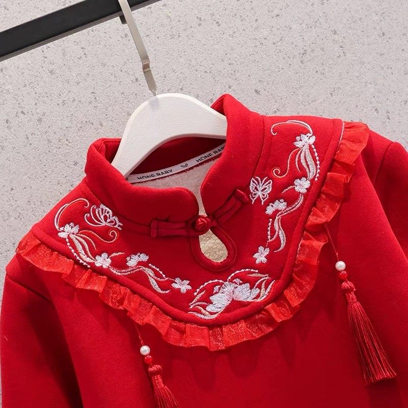 女童拜年服秋冬连衣裙2025女大童红色旗袍过年喜庆加绒儿童新年装