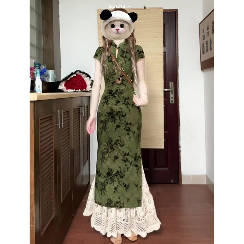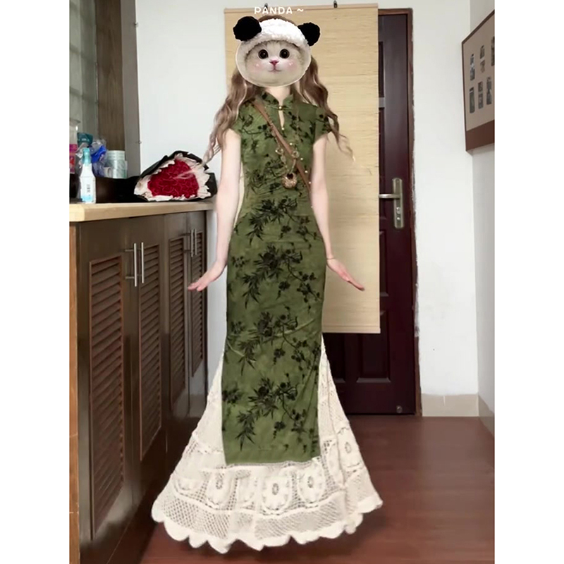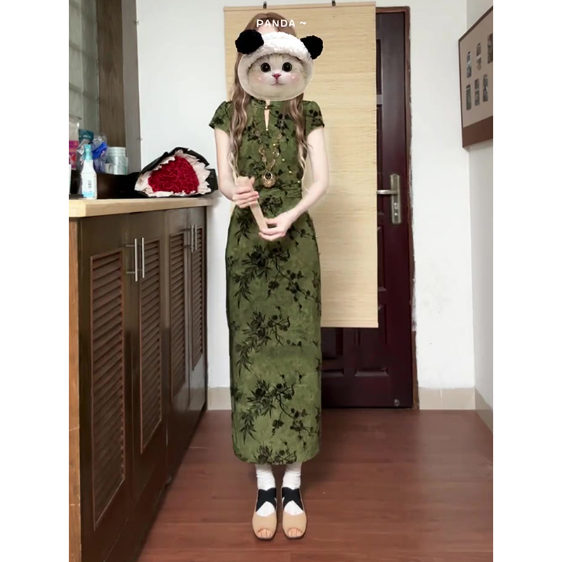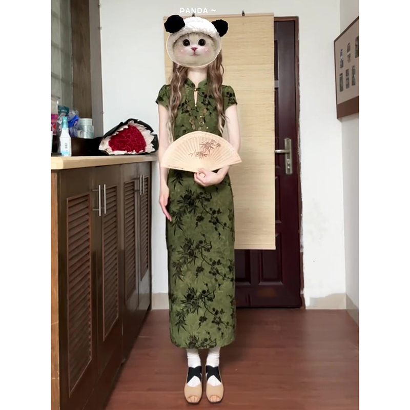 国风新中式复古绿色提花改良旗袍