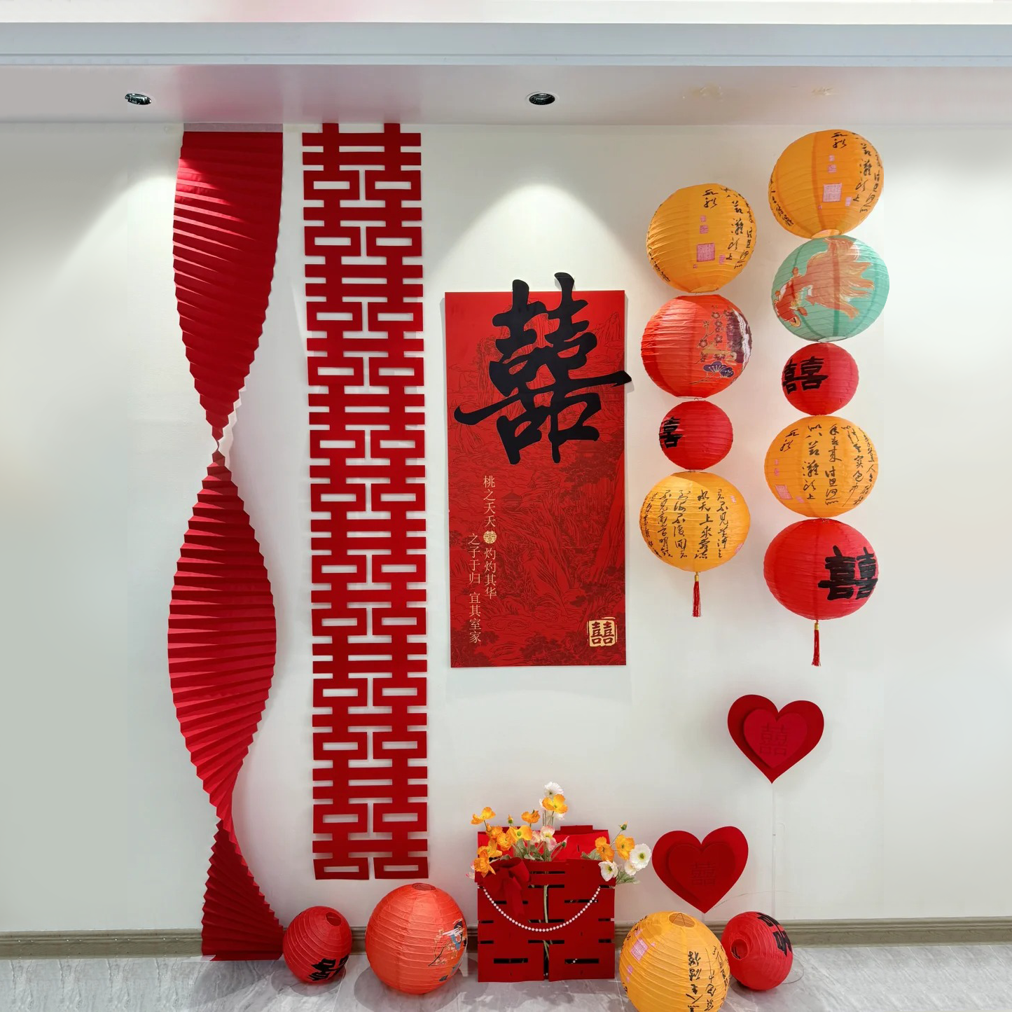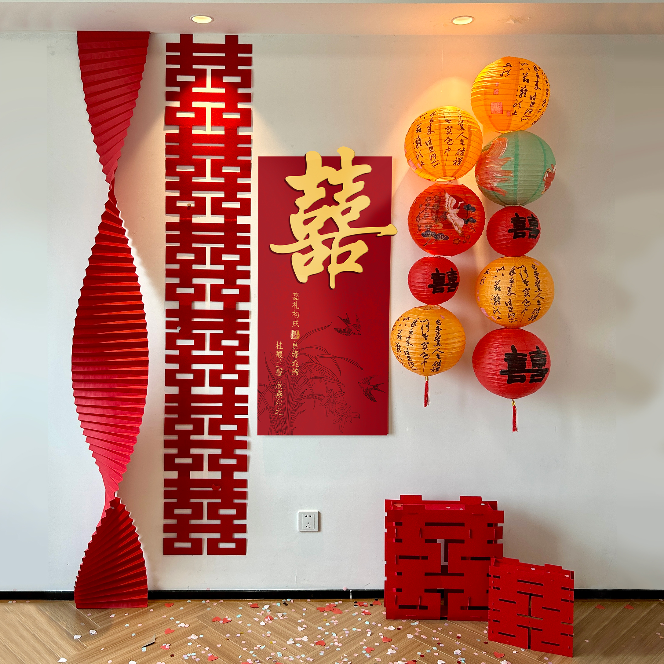 新中式结婚装饰kt板喜字贴婚房客厅卧室喜庆背景墙拉花囍布置挂件