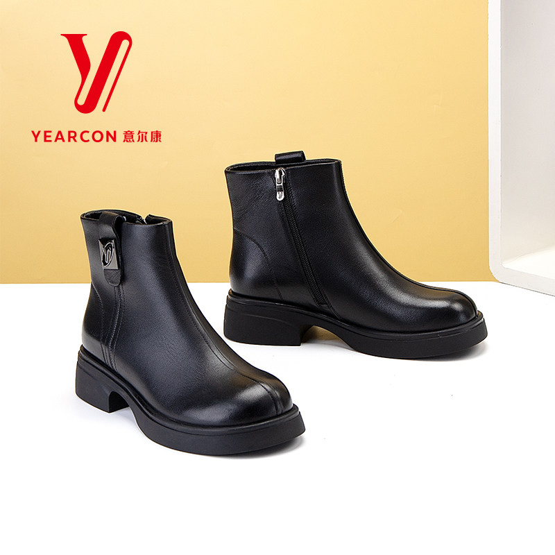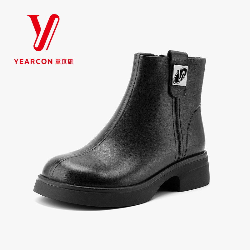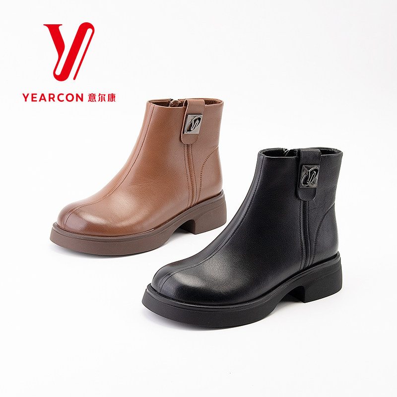 意尔康女靴2025新款秋冬季加绒短靴女粗跟真皮靴子中跟时装瘦瘦靴