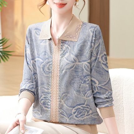 妈妈春装翻领长袖打底小衫中老年女装新款T恤针织羊毛衫薄