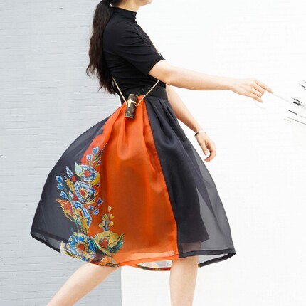 亦克阿瑟新款撞色印花蓬蓬裙 复古优雅中长裙欧根纱半身裙女夏