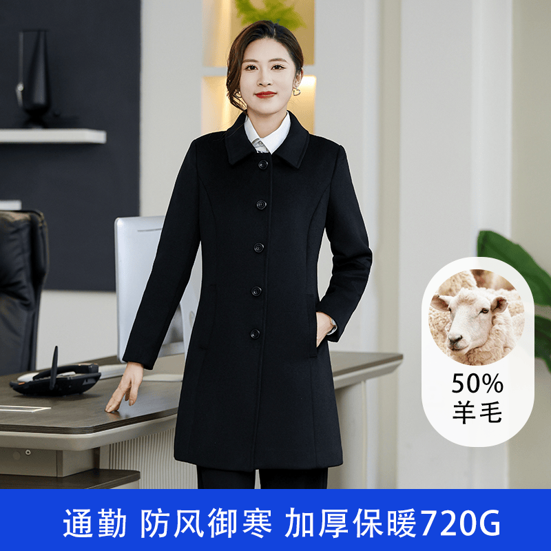 冬季新款黑色中长款羊毛呢大衣工作服外套不掉毛前台银行职业女性