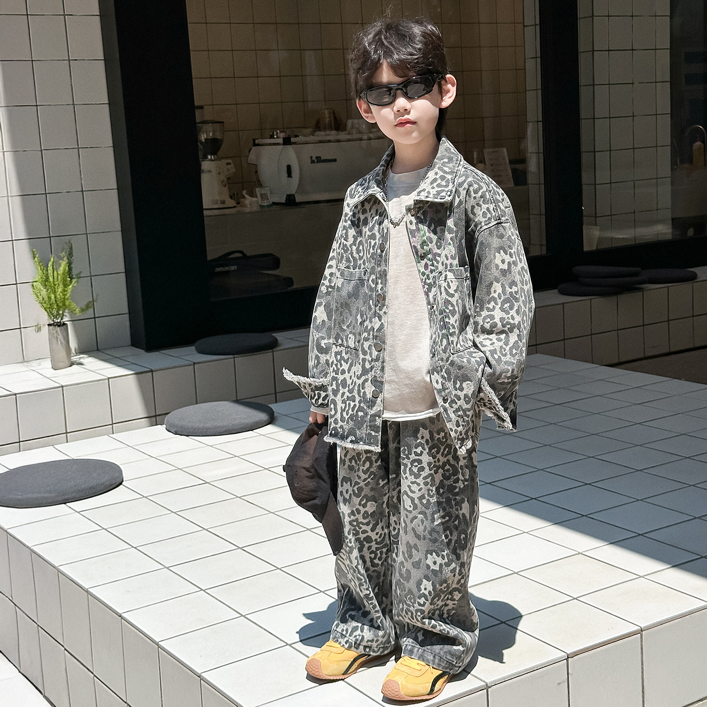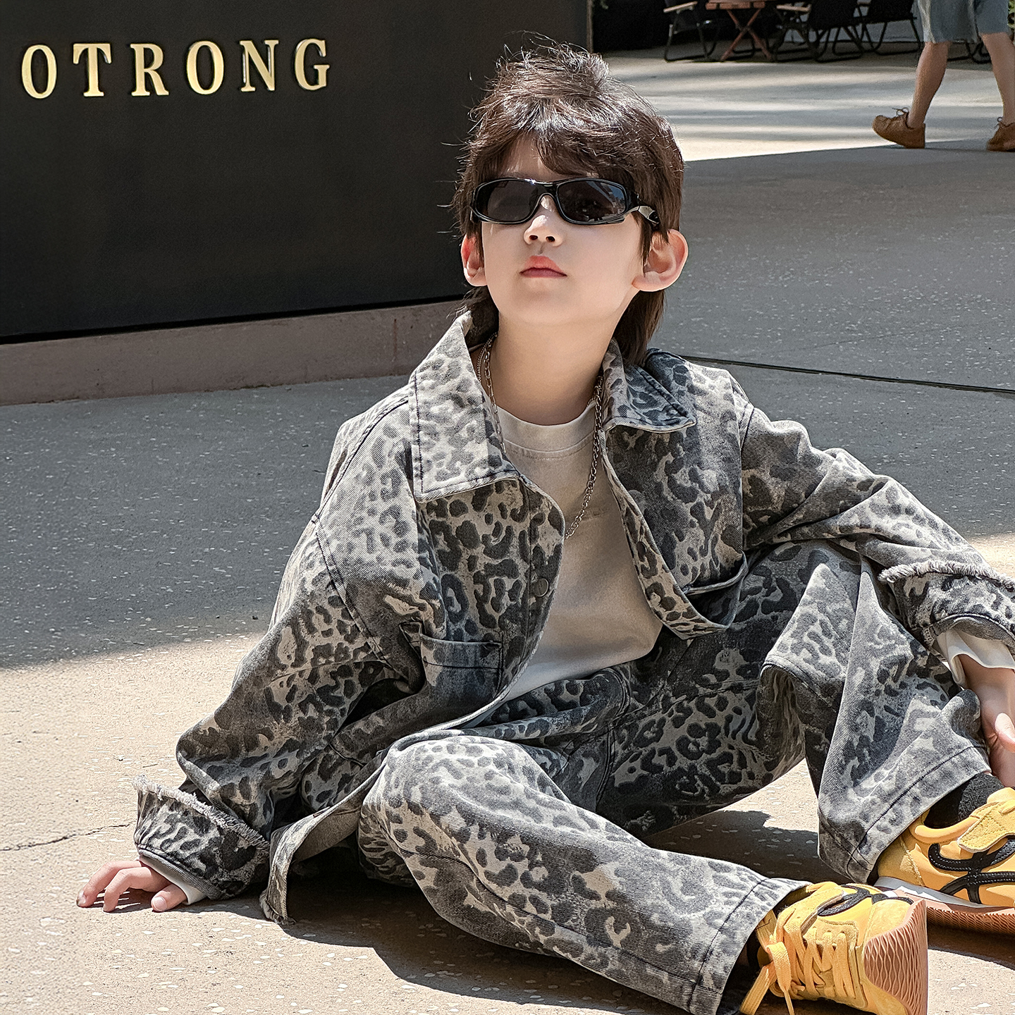 男童套装儿童秋季韩版2025新款童装潮牌豹纹牛仔外套牛仔裤两件套