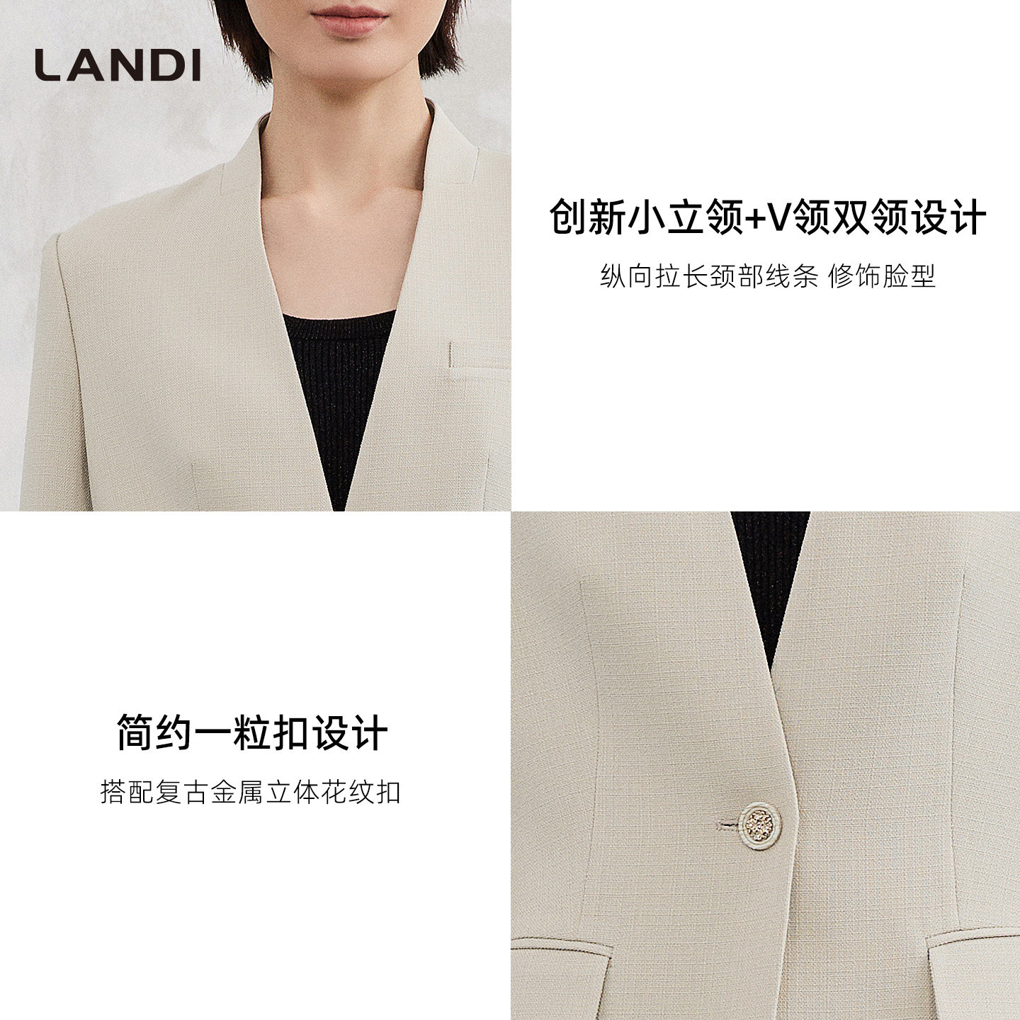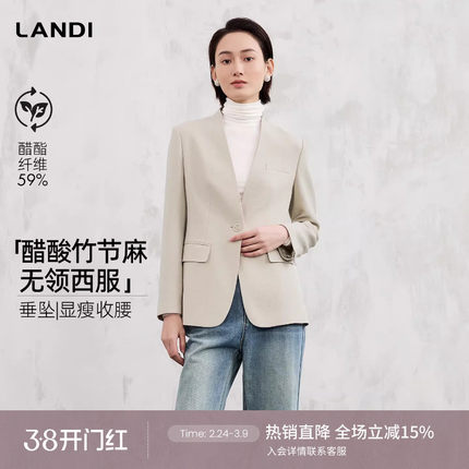 [职场精英]LANDI素米白醋酸竹节麻无领西装外套女春新品