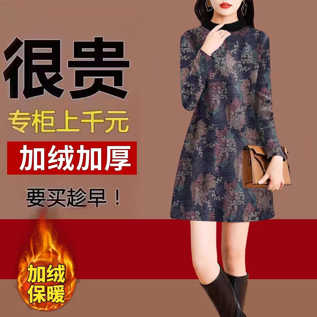 加绒加厚打底衫女2024秋冬季新款长袖印花修身显瘦减龄中款连衣裙