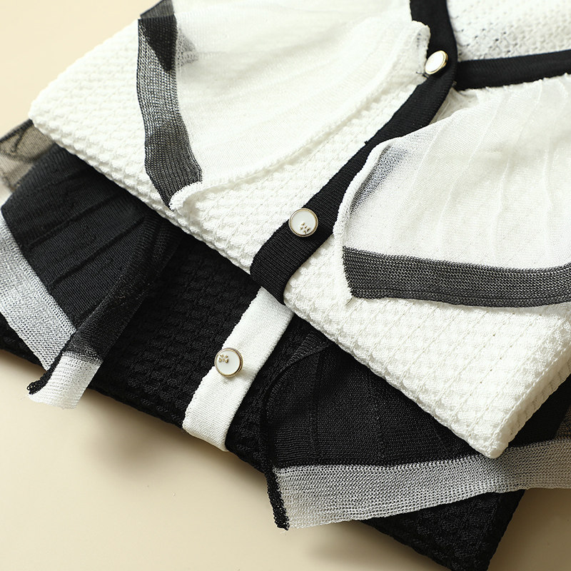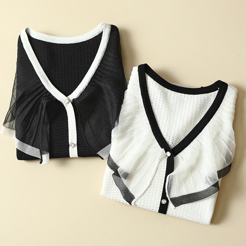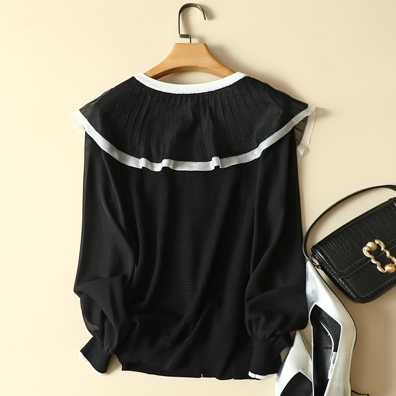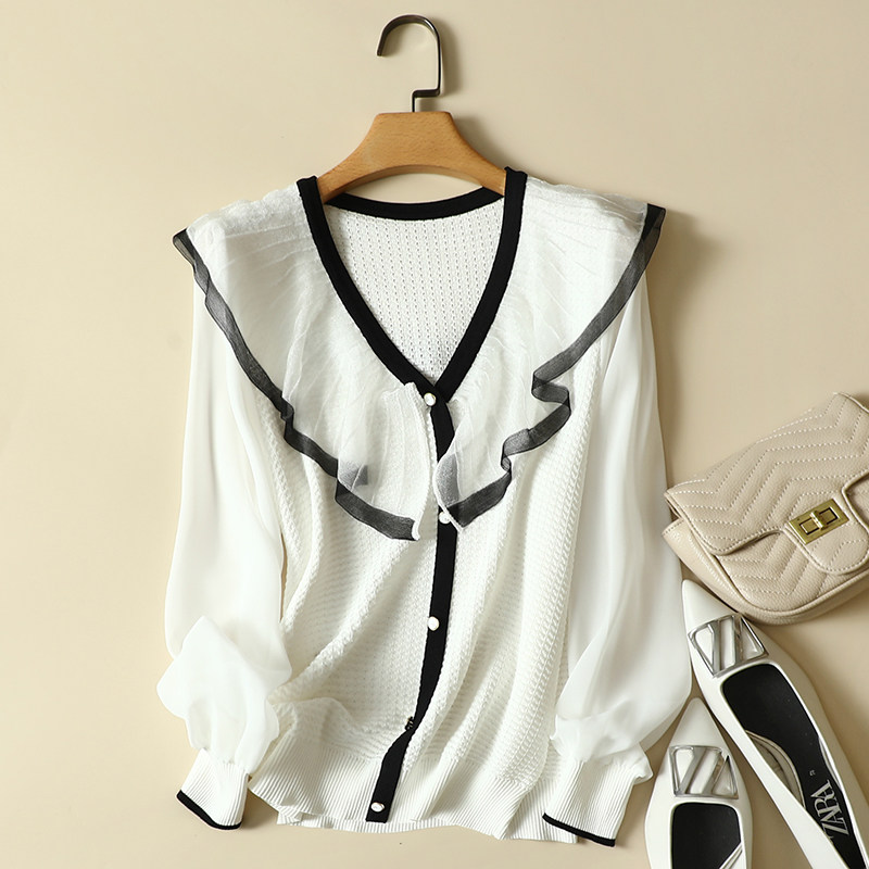 春装2024年新款雪纺袖冰丝针织假开衫女宽松上衣洋气蕾丝打底衫女