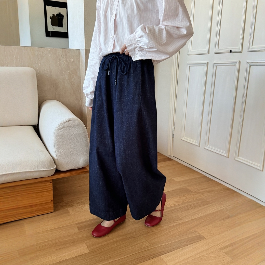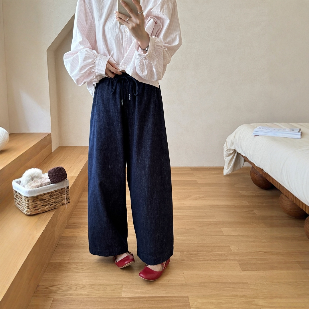 复古文艺防褪色松紧腰系带宽松版显瘦休闲牛仔裤直筒阔腿裤长裤女
