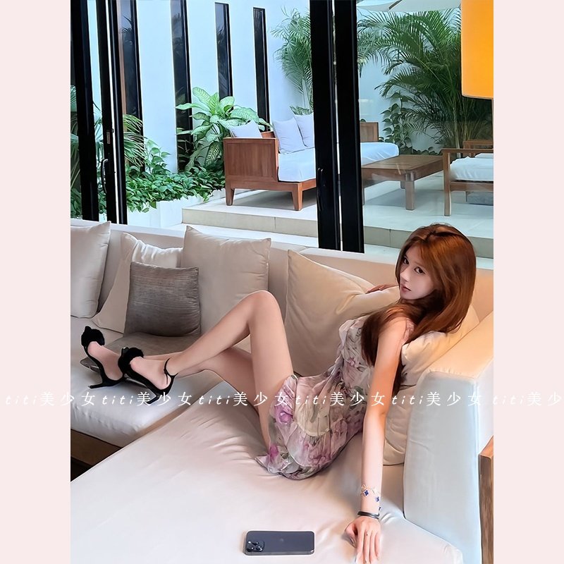 【TiTi美少女】法式气质碎花吊带连衣裙女荷叶边印花V领收腰短裙