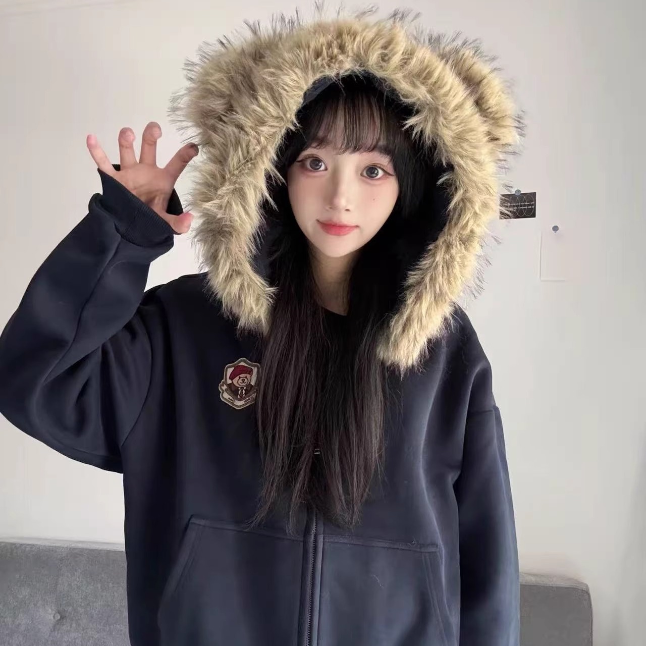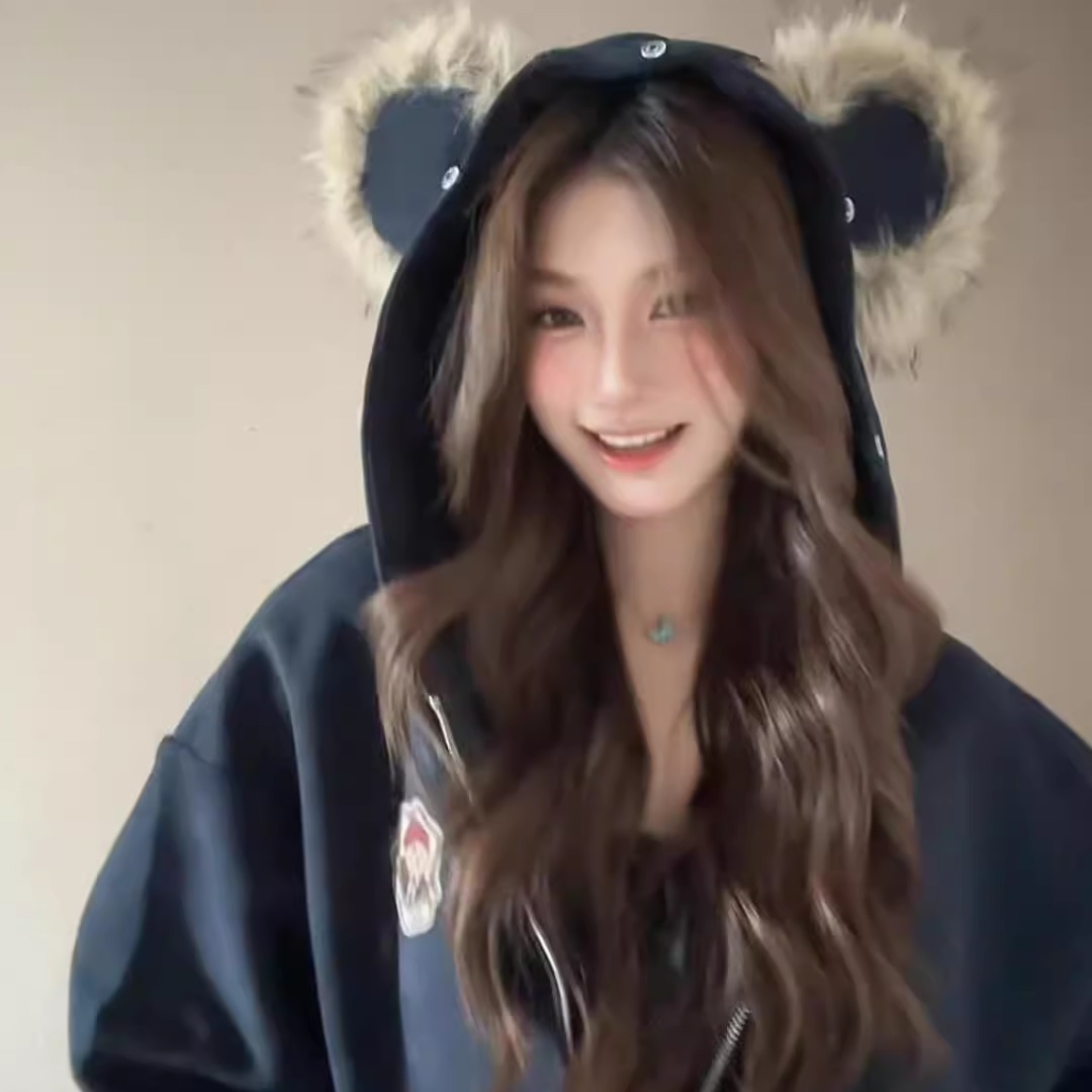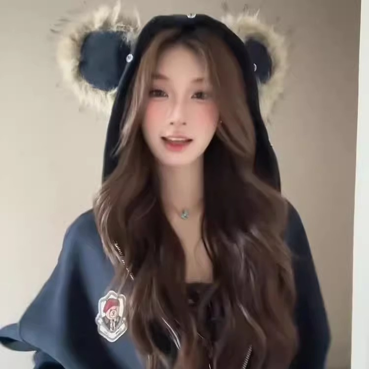 美式国潮可爱小熊耳朵毛领开衫外套女2025秋冬新款设计感拉链外套