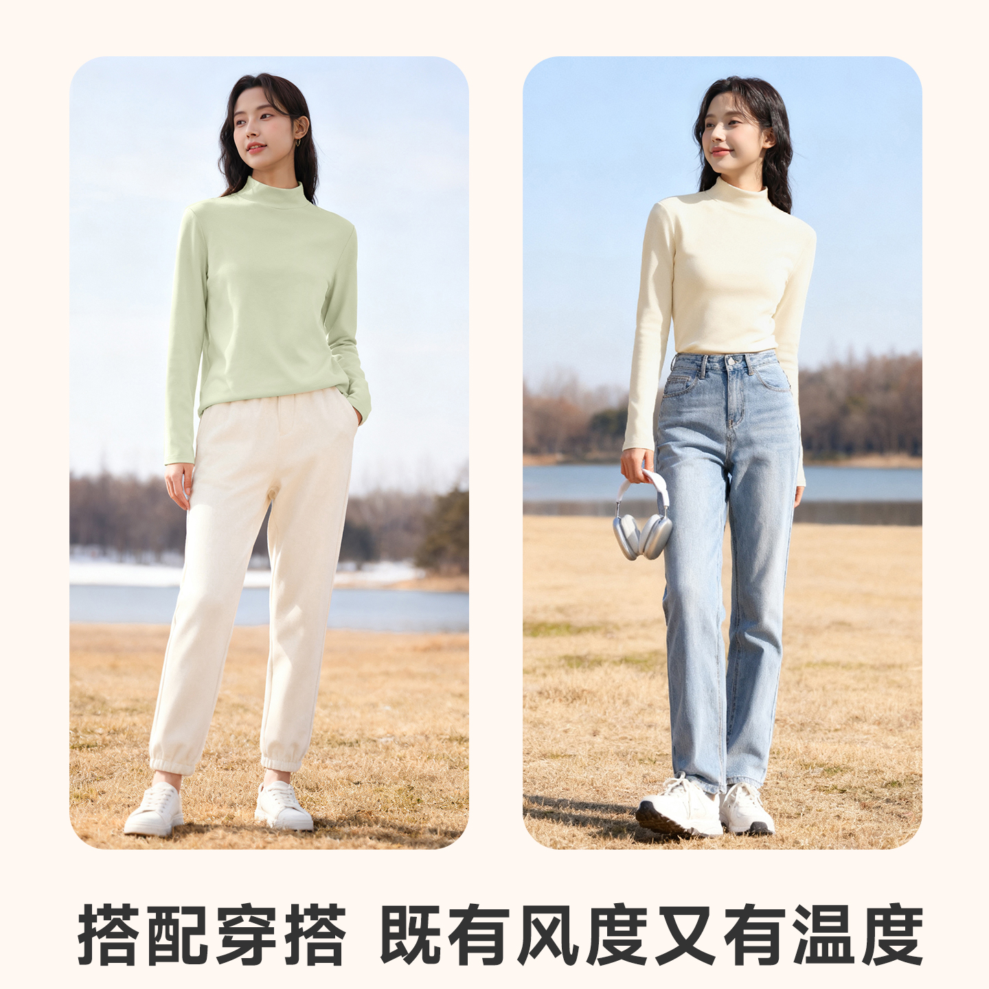 班尼路杏色双面绒半高领内搭打底衫女款2025秋冬新款长袖t恤上衣H
