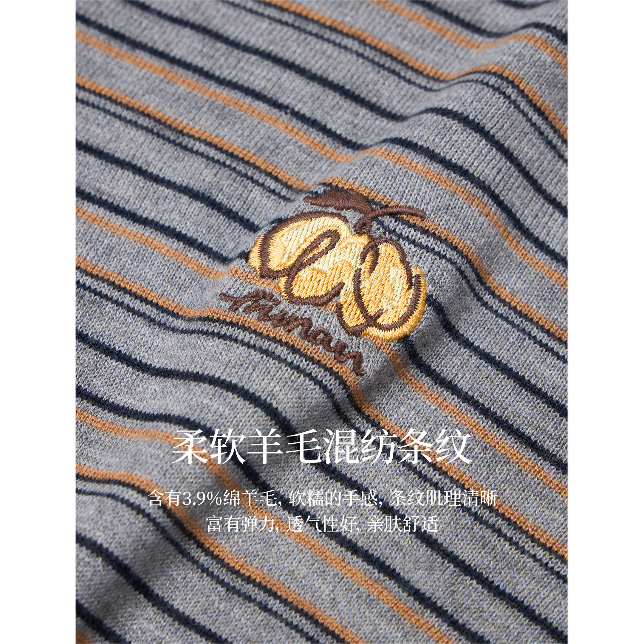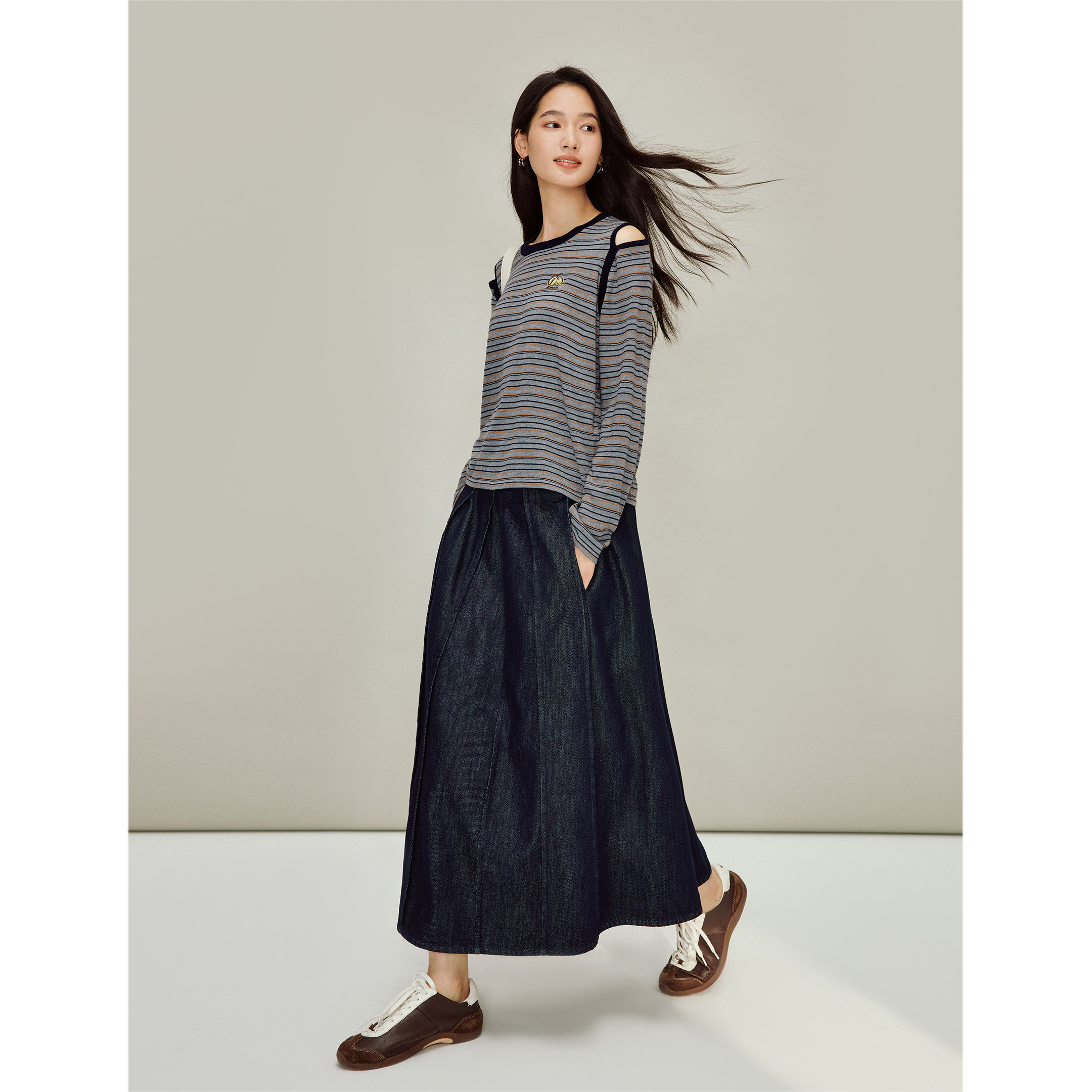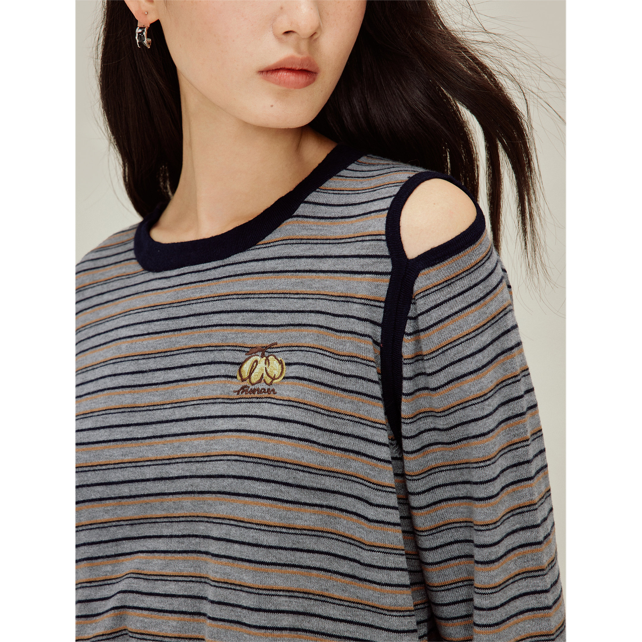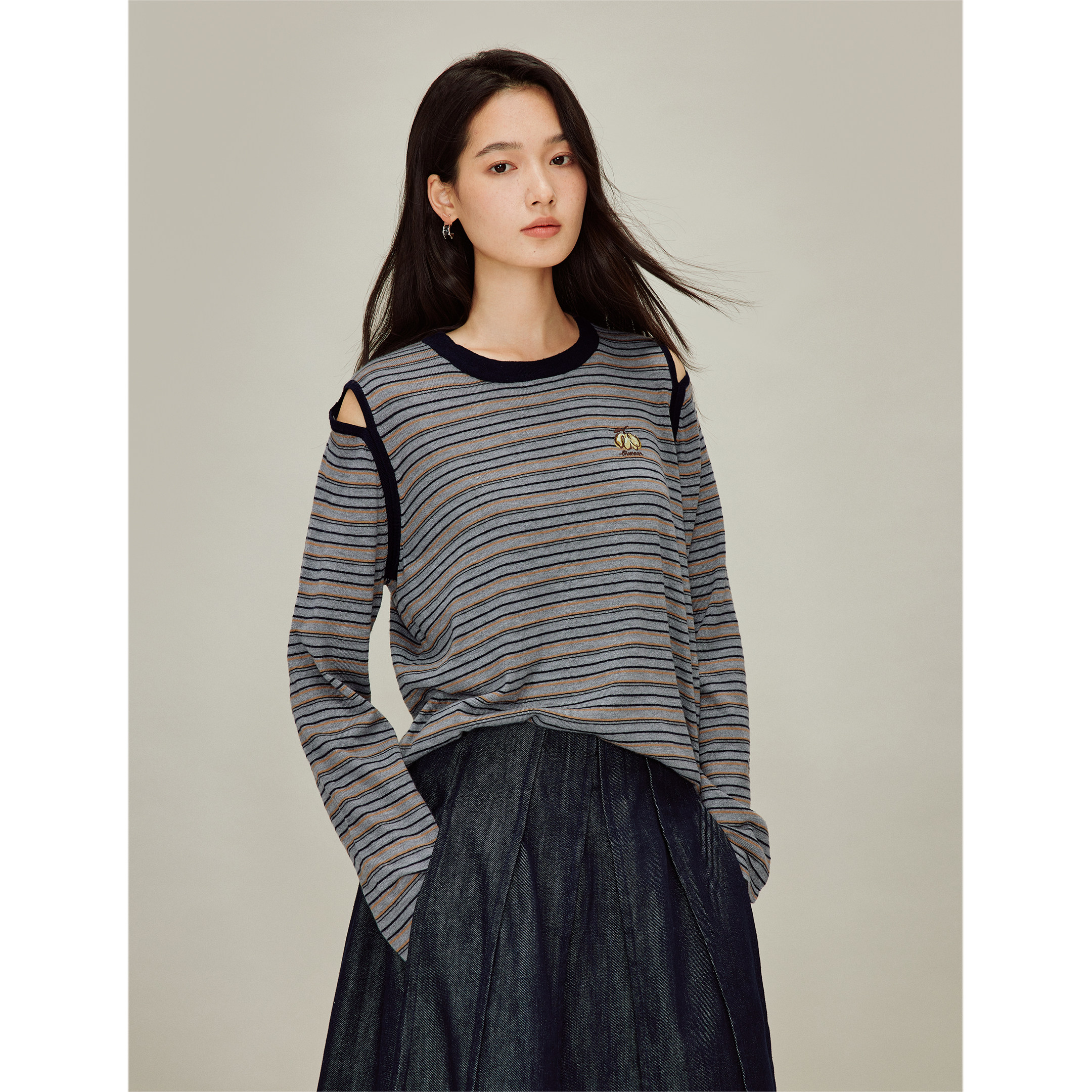茵曼撞色条纹露肩南瓜刺绣针织衫2026春季女装新款显瘦圆领上衣