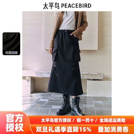 太平鸟工装风加绒中长款半身裙25冬新款大口袋可抽绳黑色长裙女