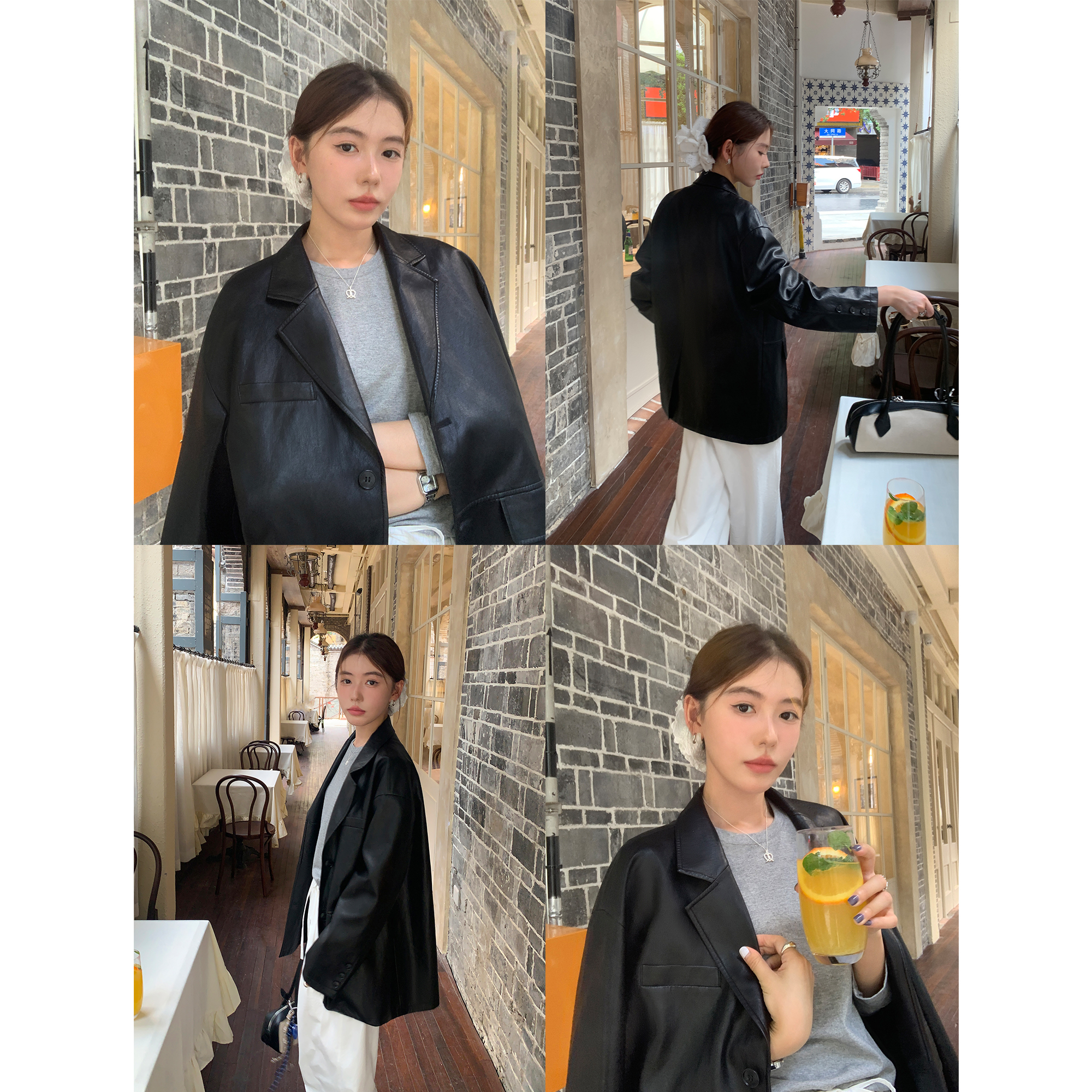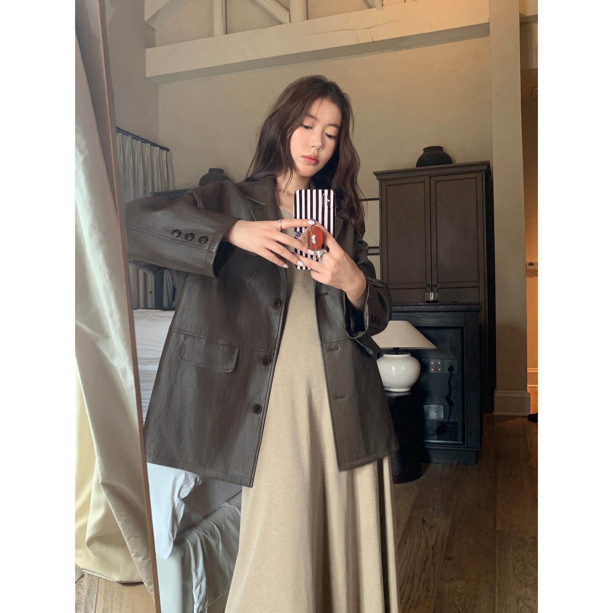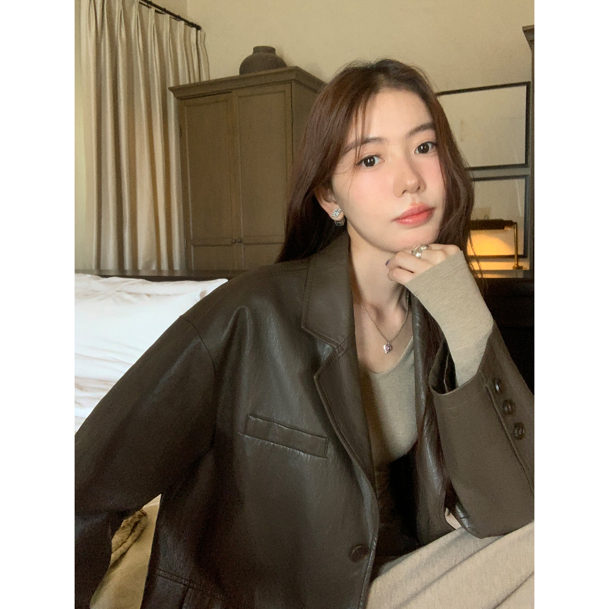 pusumede 黑色复古PU皮衣女2025春季新款宽松休闲高级感西装外套