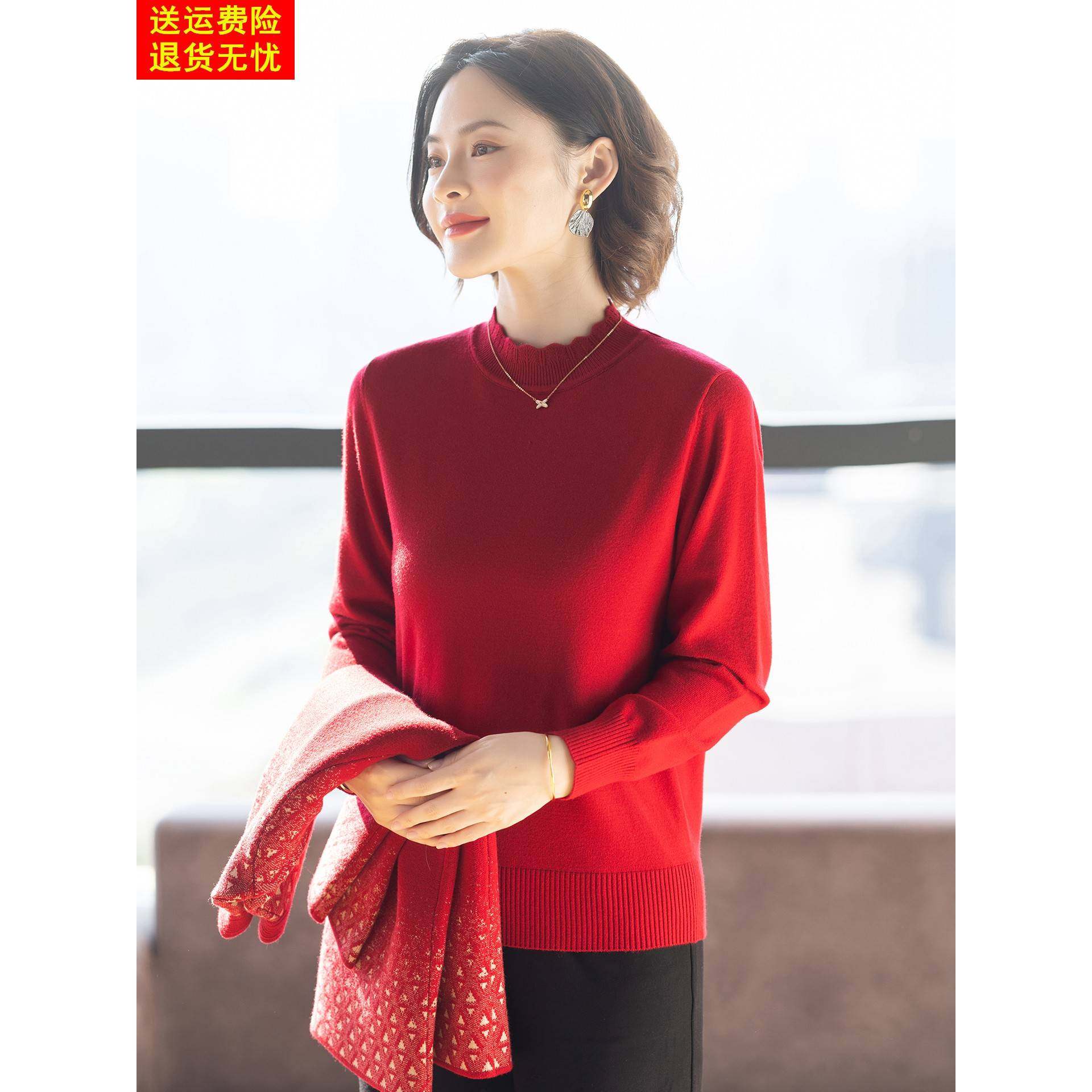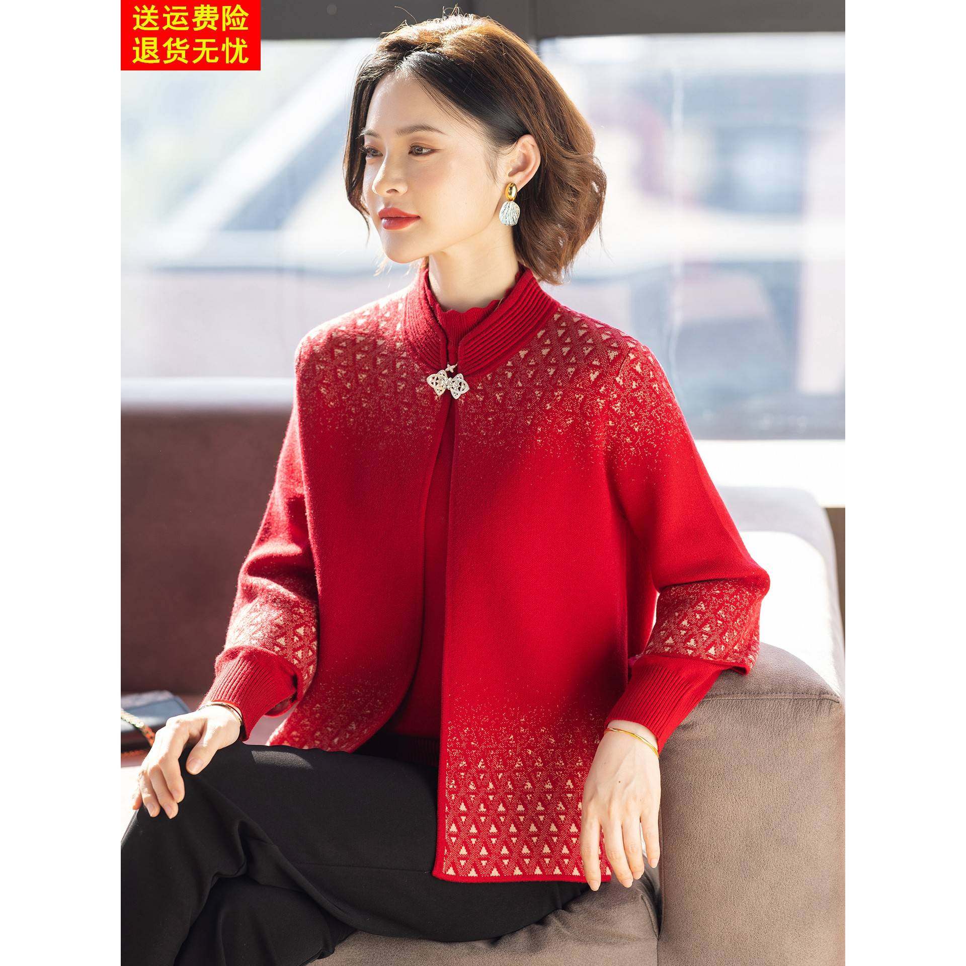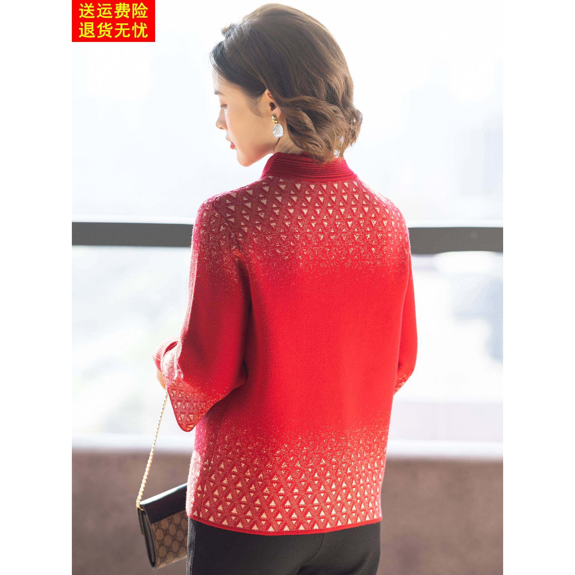 妈妈冬装套装新款外套喜婆婆婚宴毛衣两件套中老年人女红色上衣服