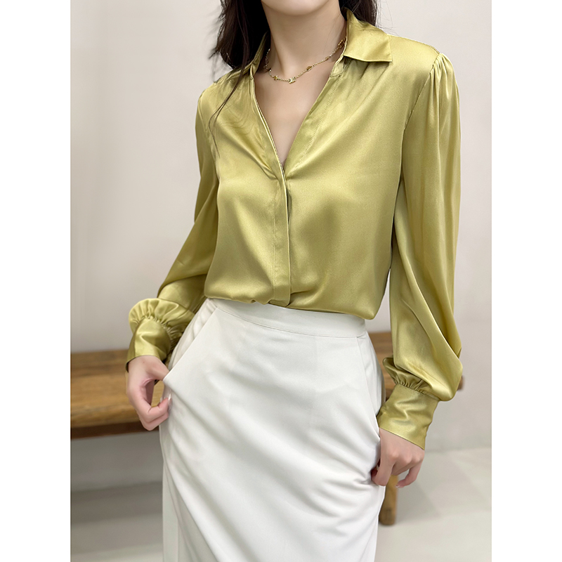 重磅真丝缎长袖衬衫女 夏季新款复古洋气通勤V领弹力缎桑蚕丝衬衣