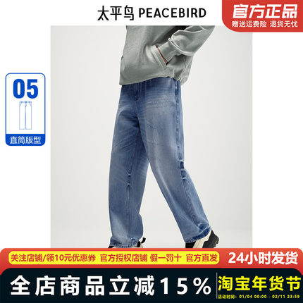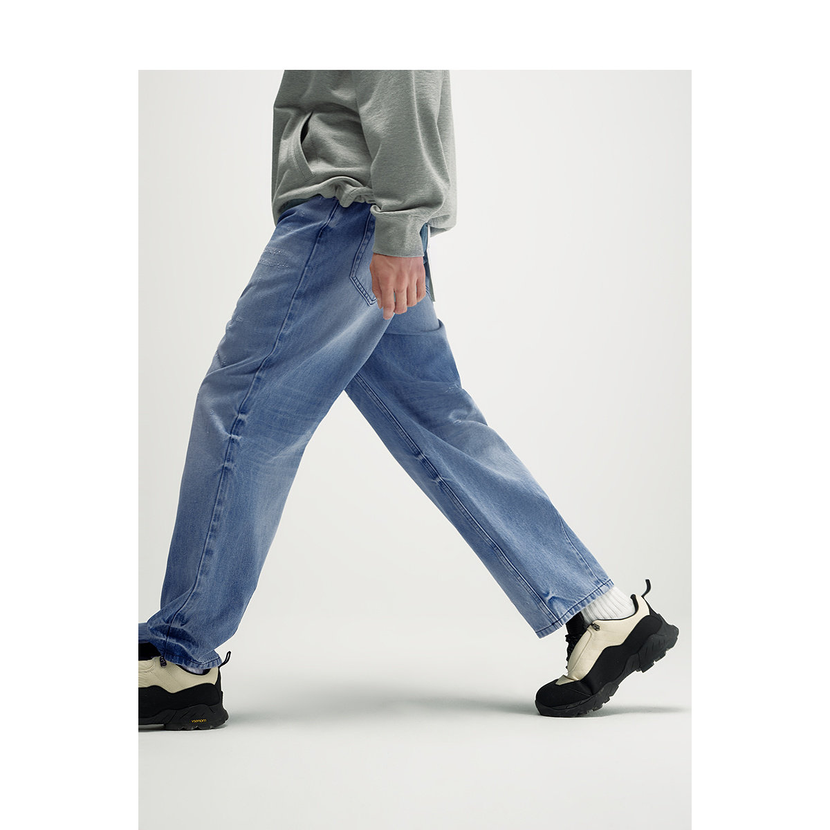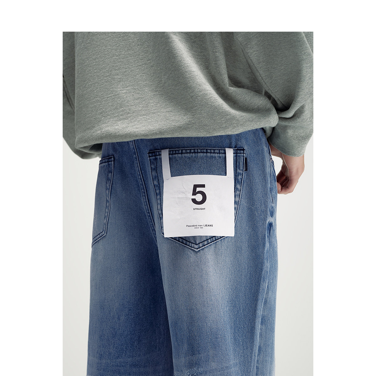 太平鸟男装牛仔裤秋季宽松直筒全棉长裤复古深色水洗潮BWHAE3217