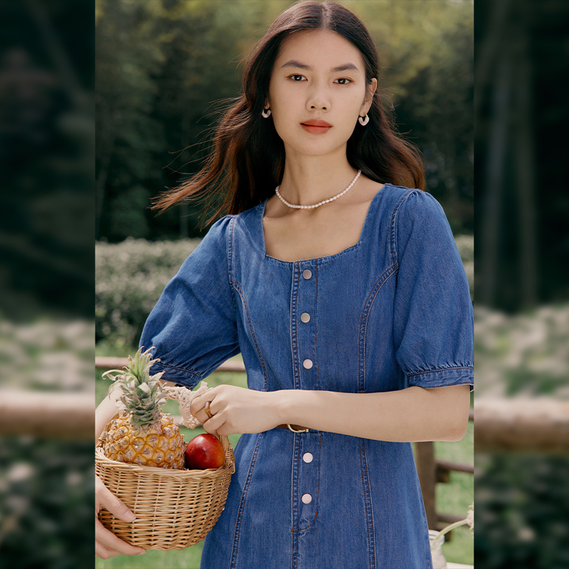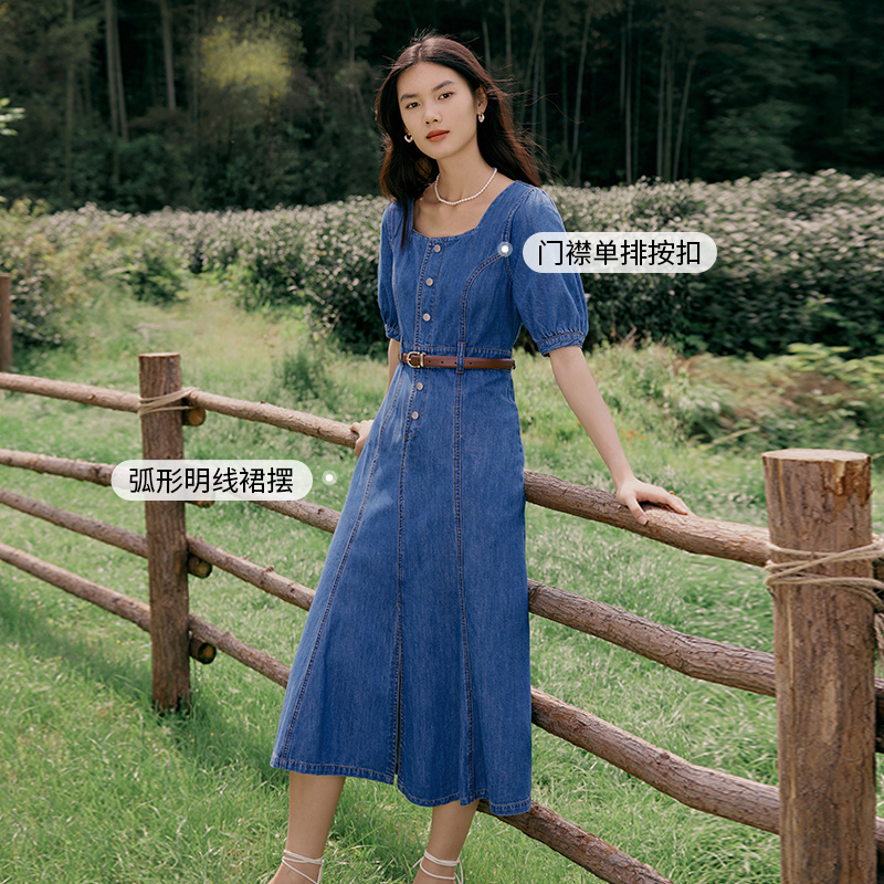 伊芙丽法式方领纽扣设计牛仔连衣裙女海边度假风夏装气质绝美裙子