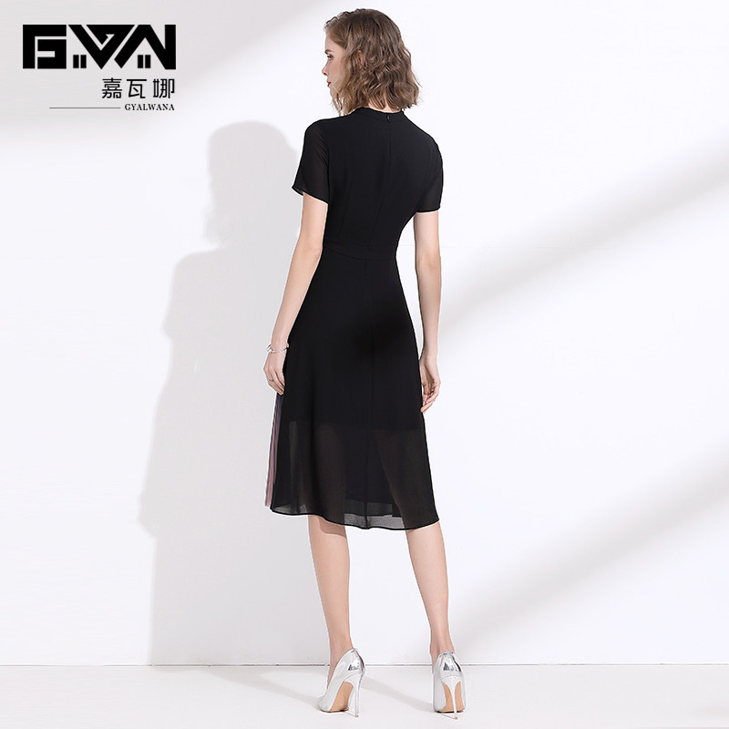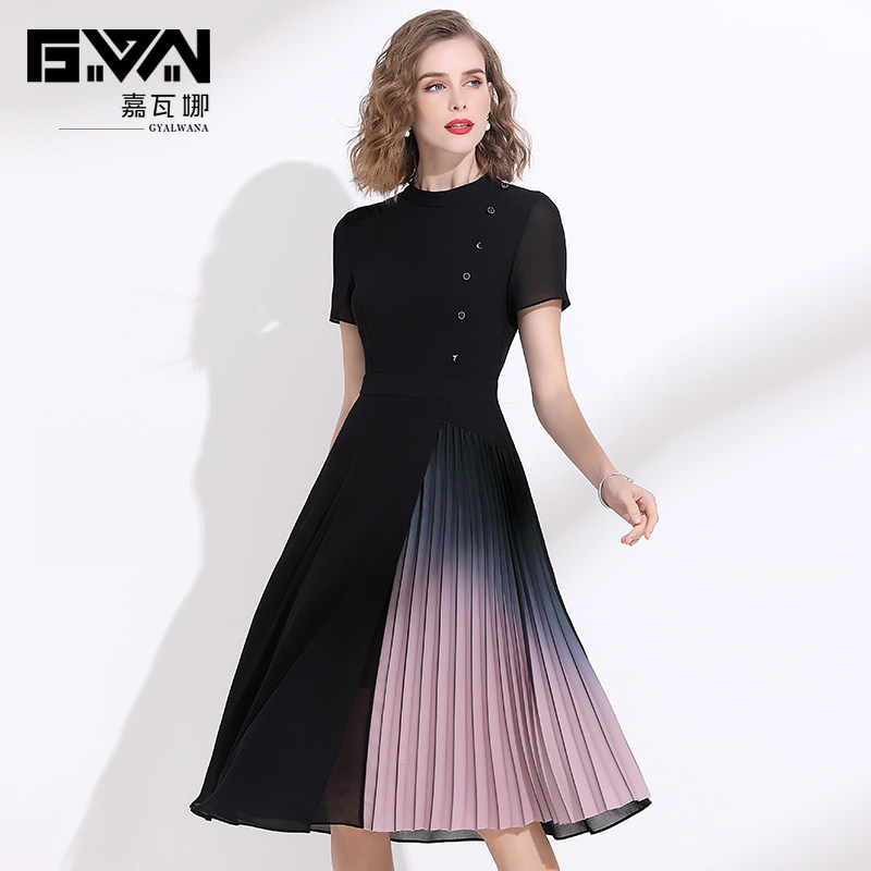 夏季新款裙子女2021渐变色收腰显瘦黑色短袖中年妈妈雪纺连衣裙
