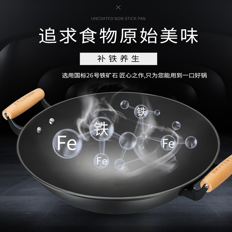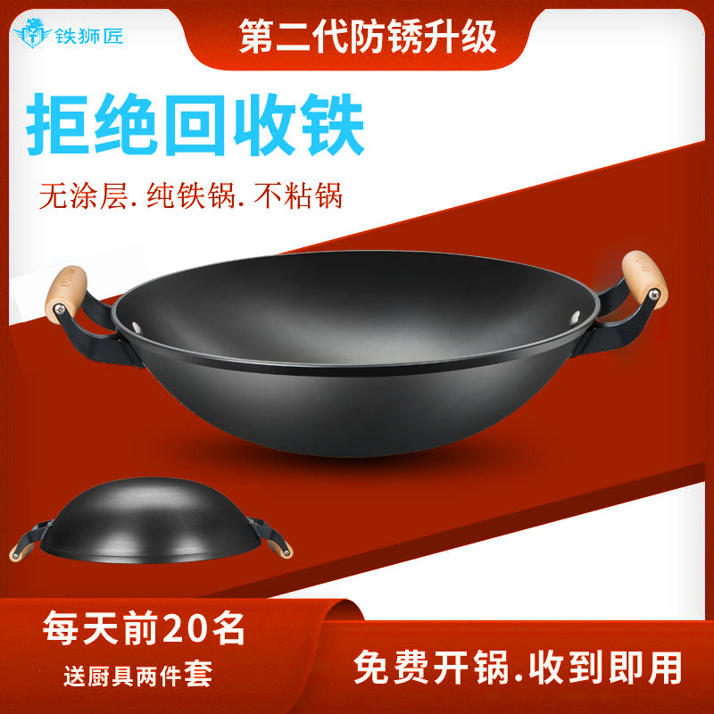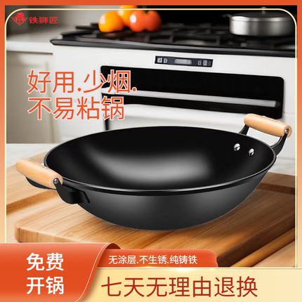 铁狮匠老式铁锅家用无涂层双耳炒菜锅不粘燃气灶生铁陆川铸铁炒锅