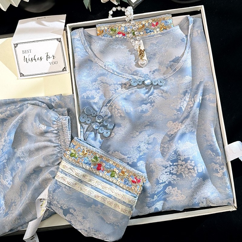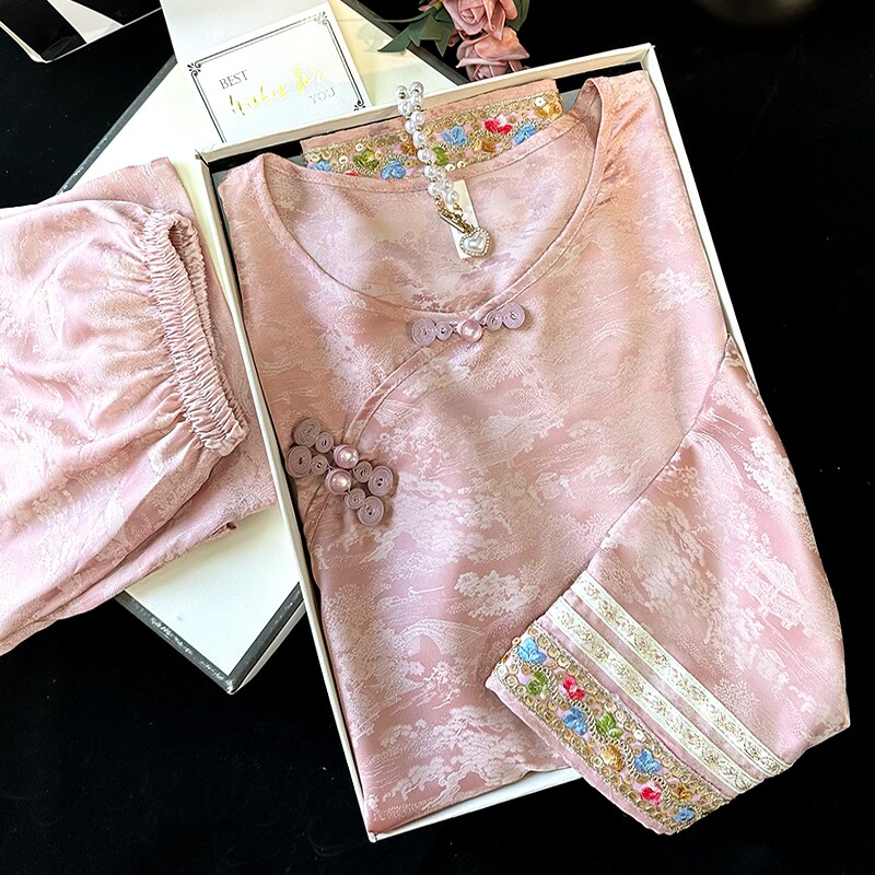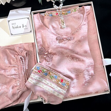新中式国风睡衣女2025春秋新款中式家居服冰丝刺绣圆领汉服套装
