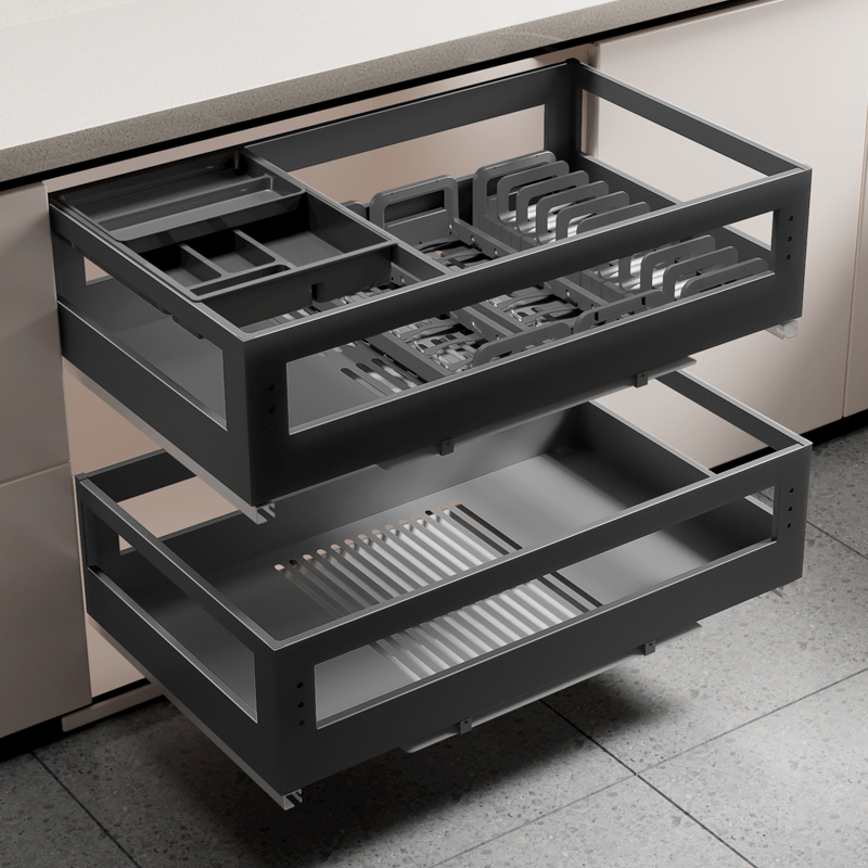厨房拉篮304不锈钢抽屉式阻尼双层调味料橱柜收纳沥水碗碟置物架