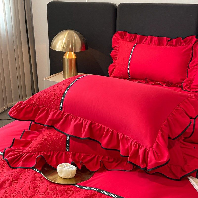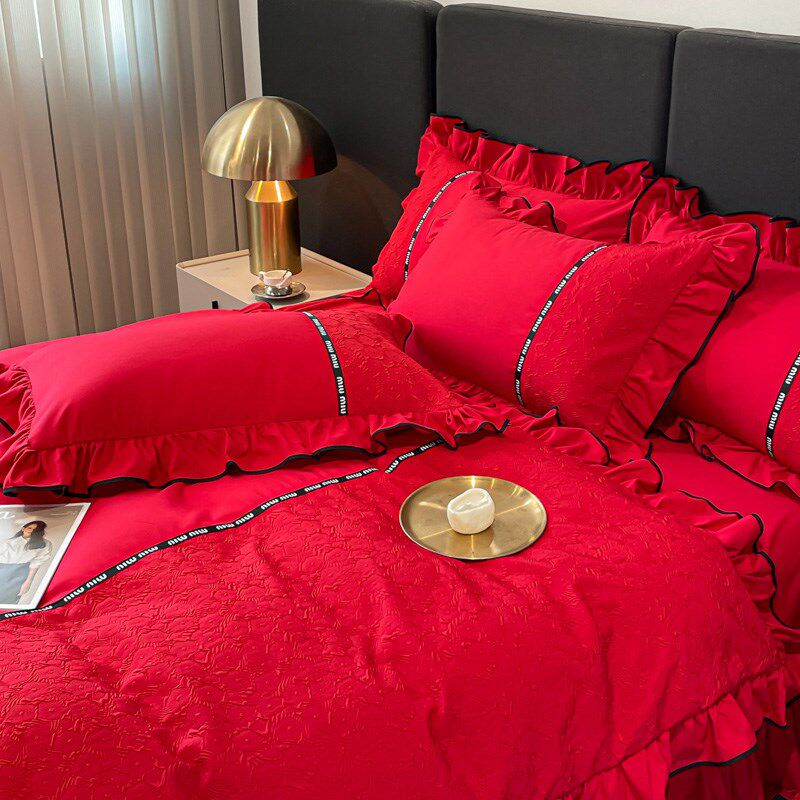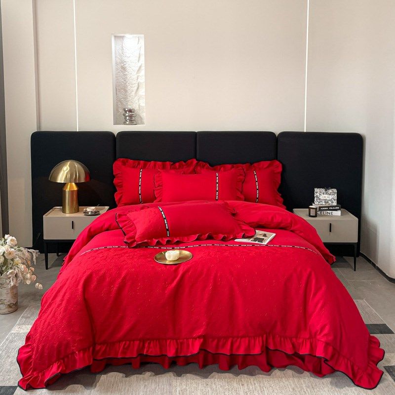 中式婚庆时尚压花撞色织带荷叶边四件套大红床单床笠床裙双人被套