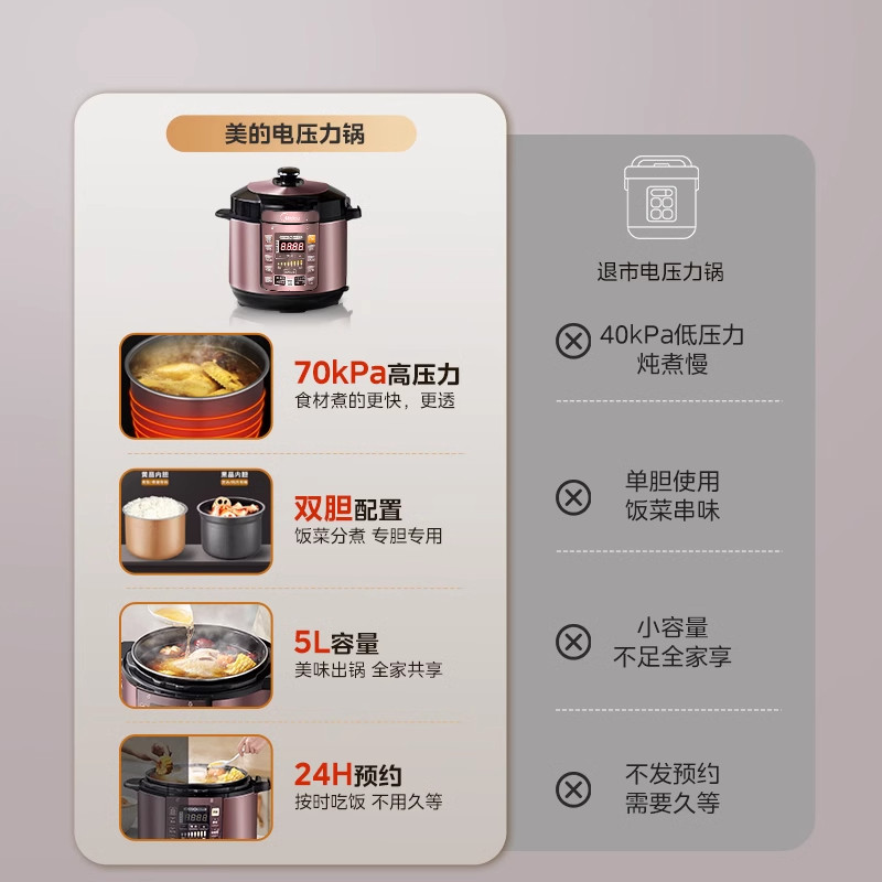美的二合一电压力锅家用5L升饭锅饭煲双胆多功能高压锅官方正品M1
