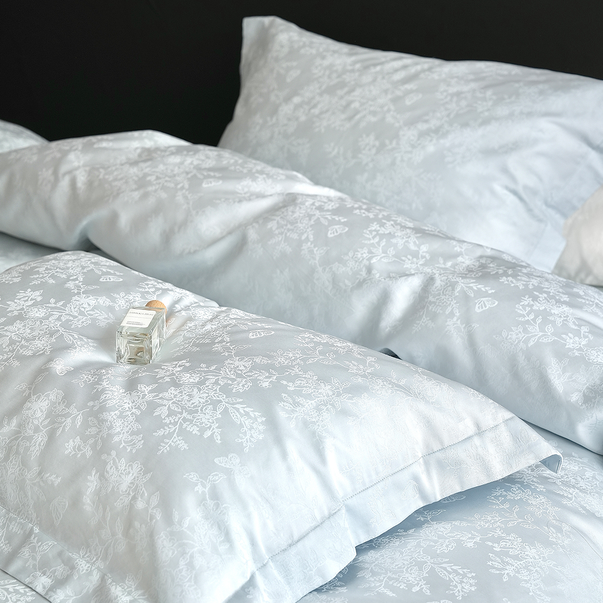 六月雨白100棉全棉贡缎轻奢提花现代淡蓝色长绒棉床单床上四件套