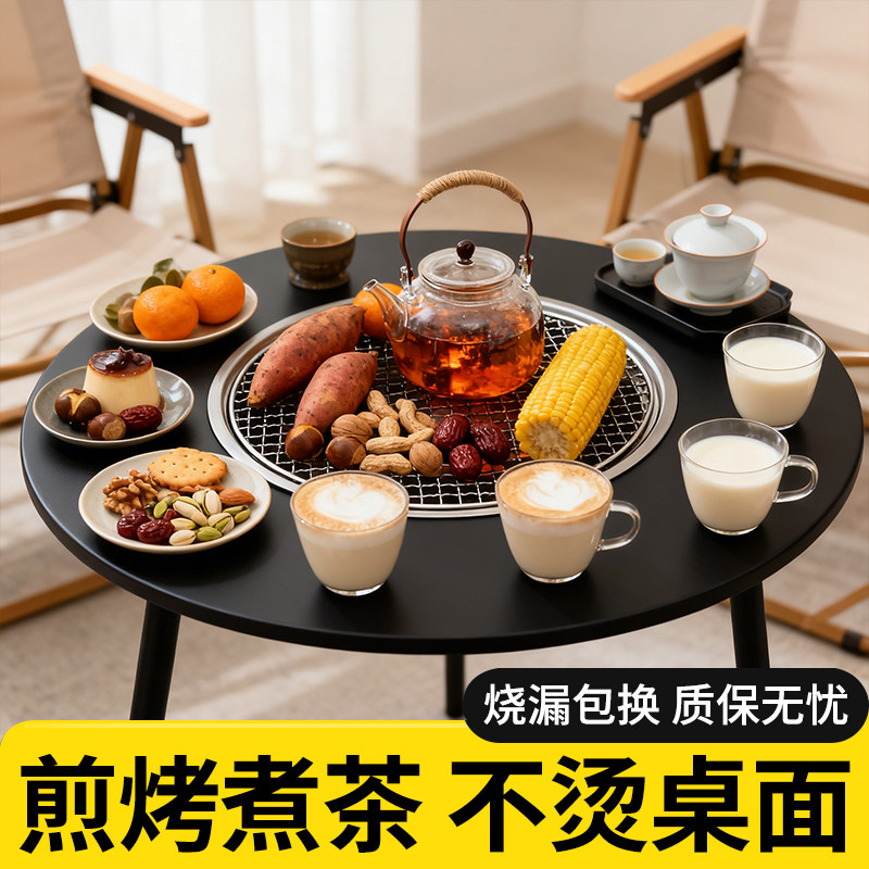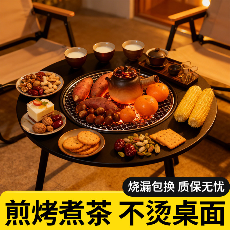 室外围炉煮茶户外茶桌阳台庭院烧烤实木圆桌子烤火炉套装多用餐桌