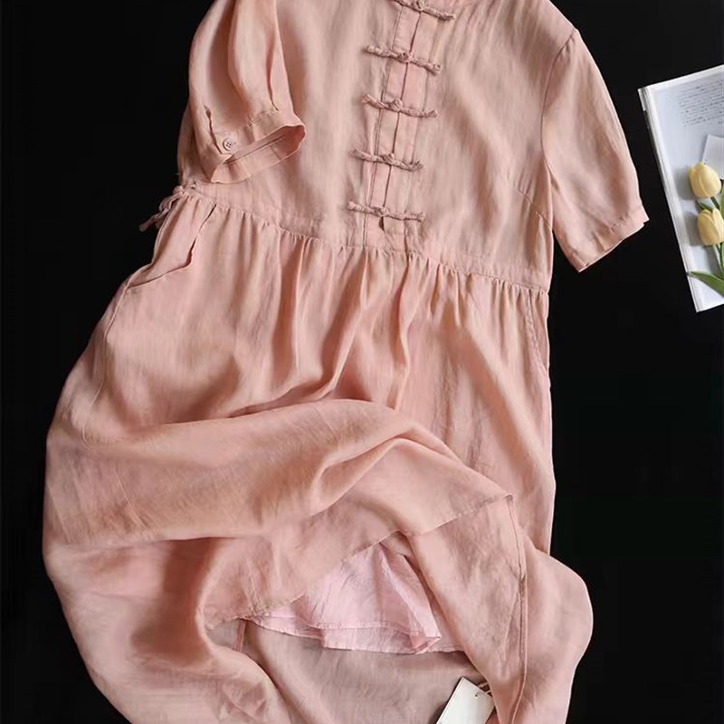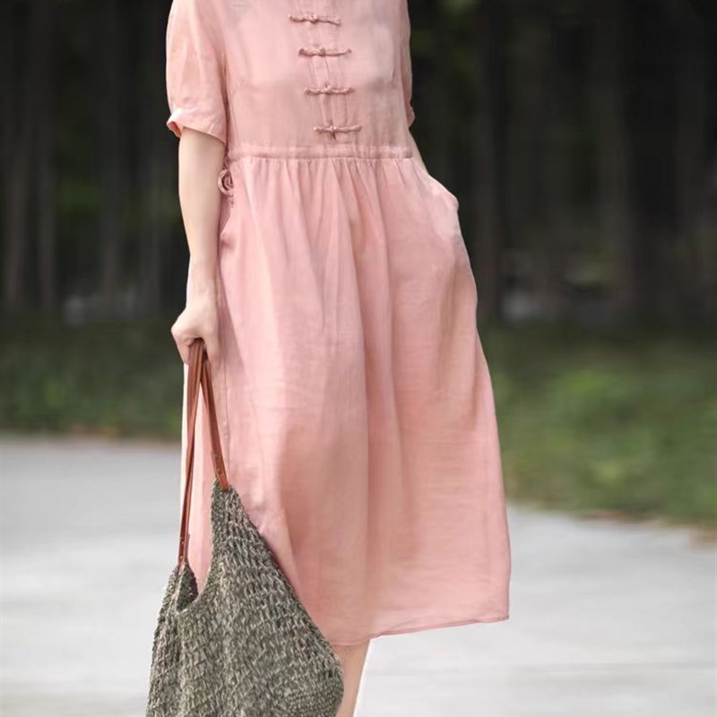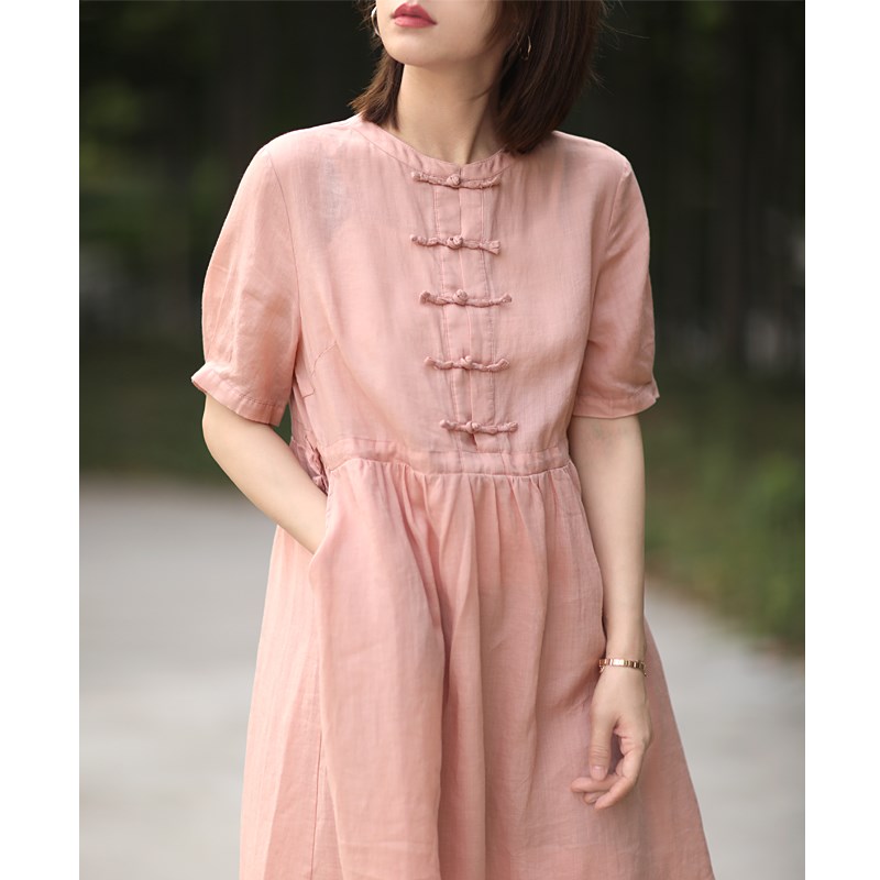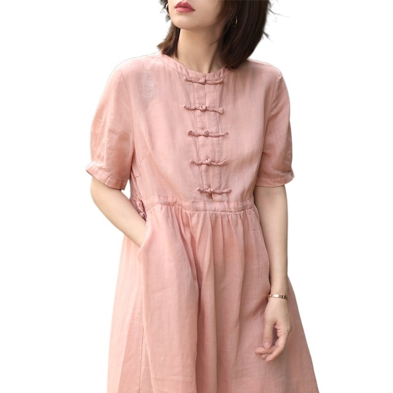 速发~新中式粉色盘扣苎麻连衣裙收腰大摆棉亚麻中长裙