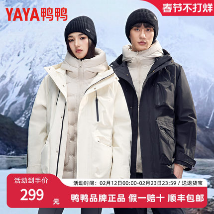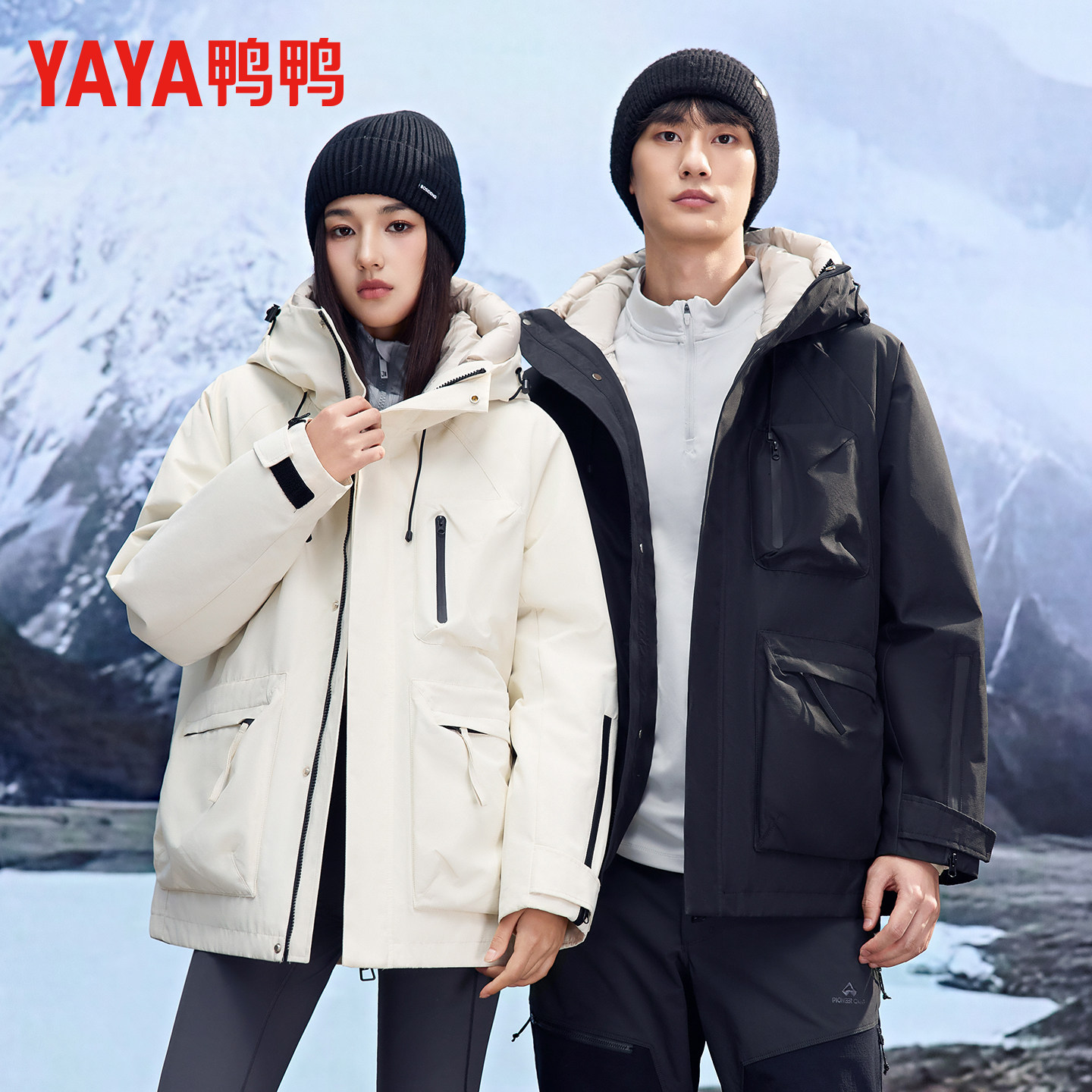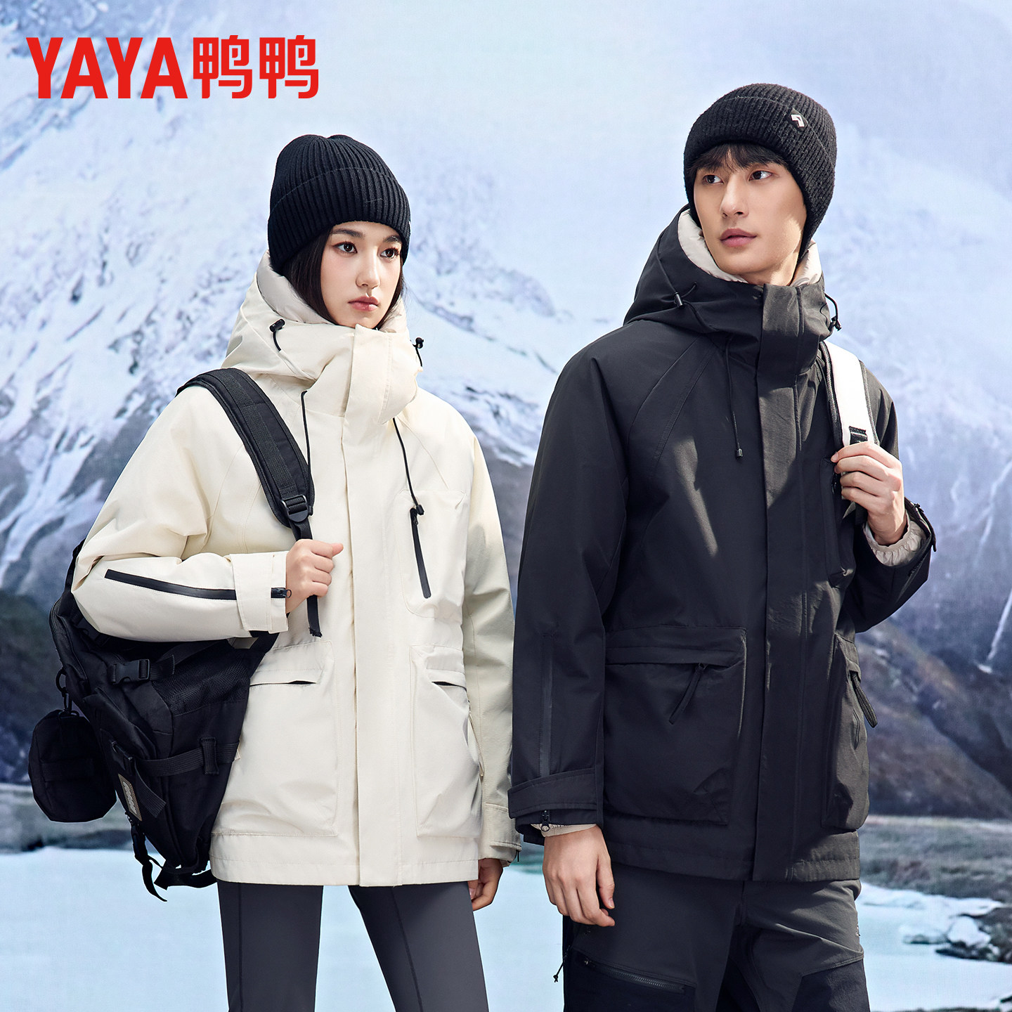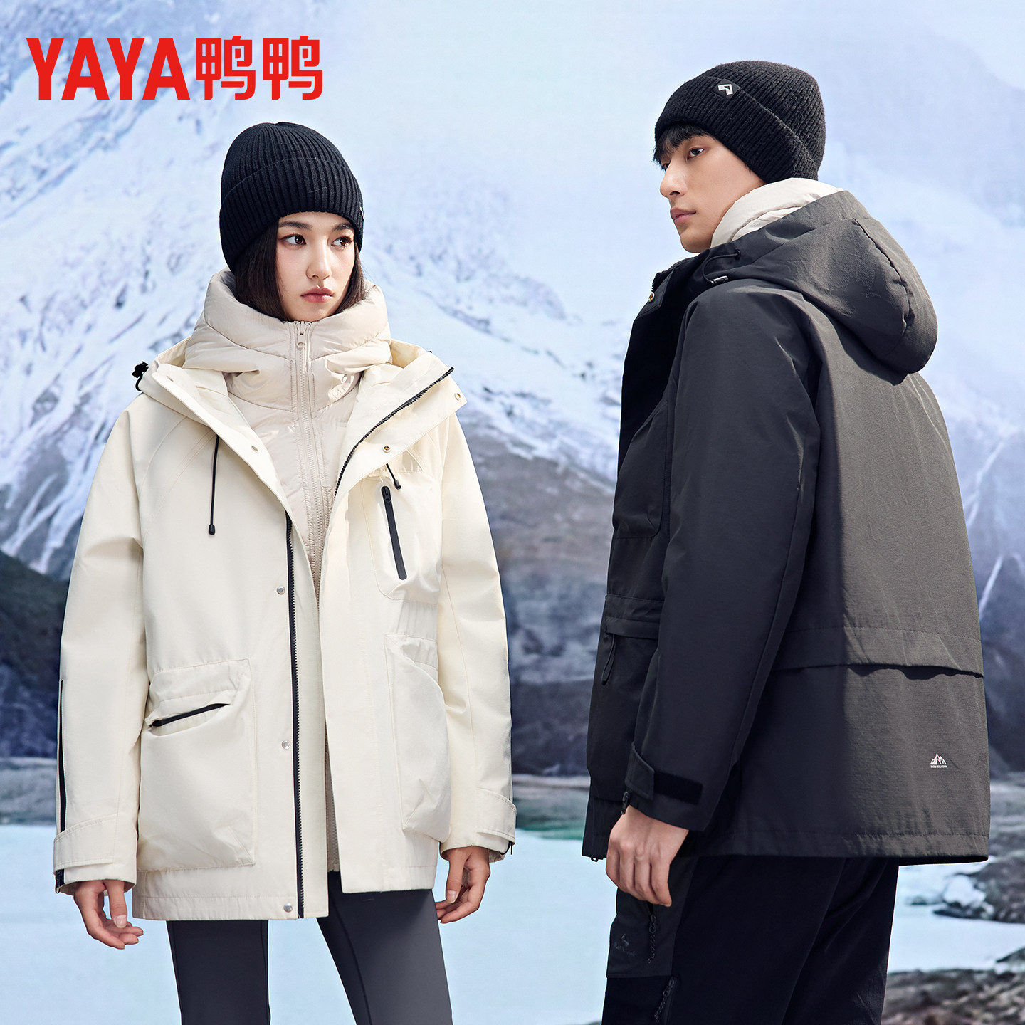 鸭鸭可脱卸内胆羽绒服男女2025冬季新款短款连帽三合一冲锋衣外套