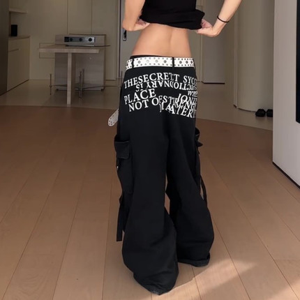 大码美式复古印花工装牛仔裤女潮牌宽松显瘦垂感阔腿拖地长裤子潮