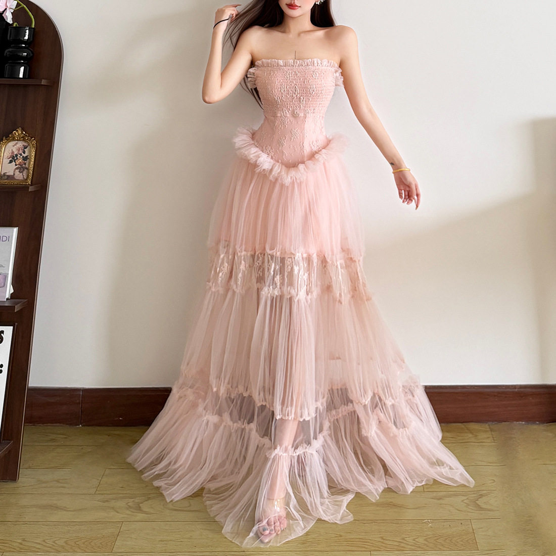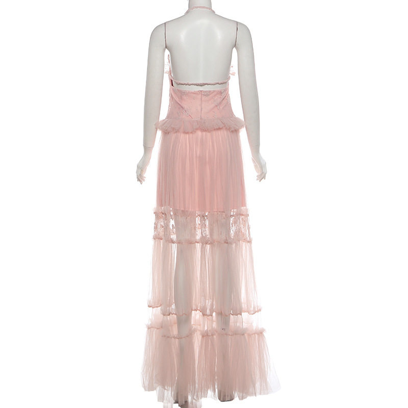 2026夏欧美新款水光纱蕾丝提花拼接长款挂脖纱连衣裙印花仙女长裙