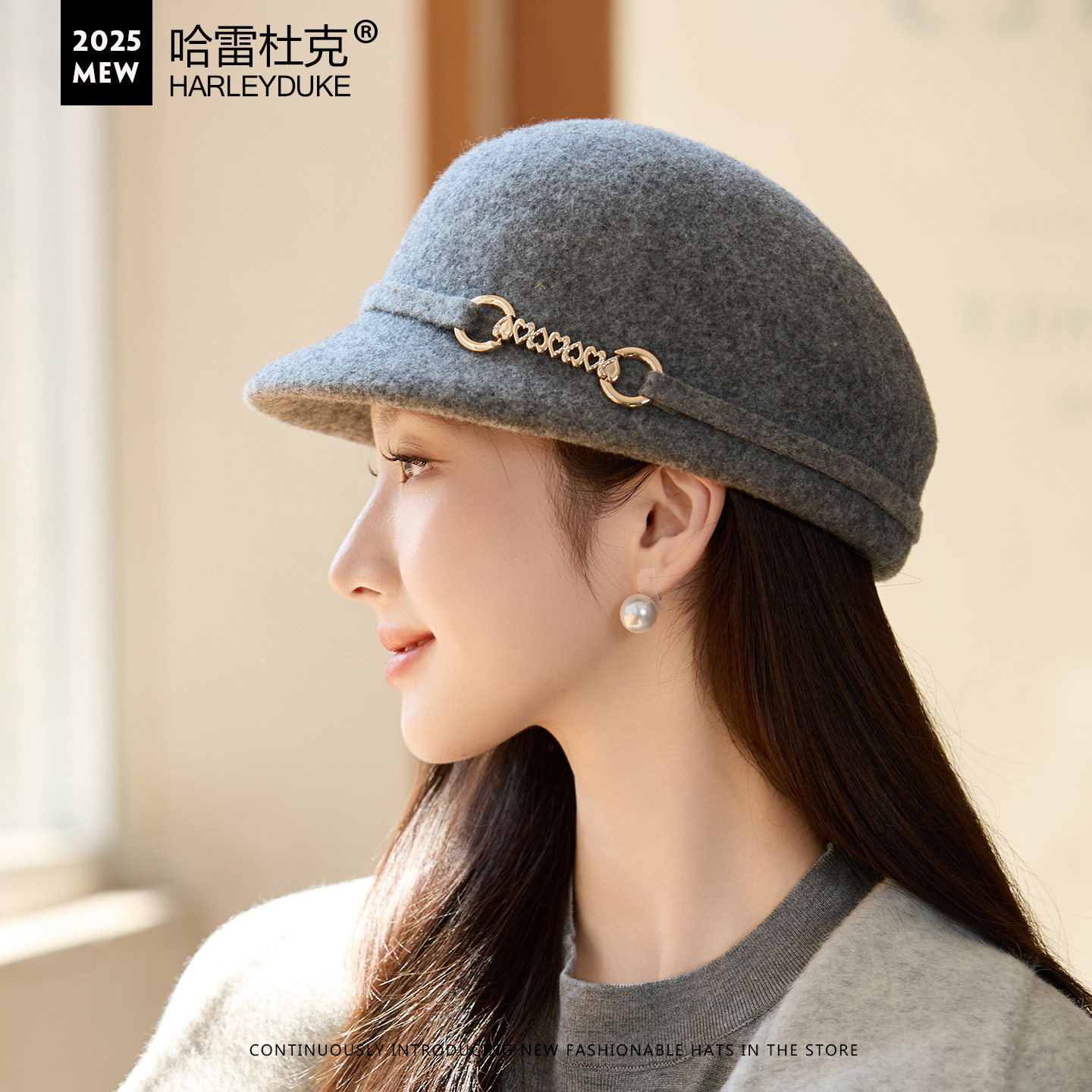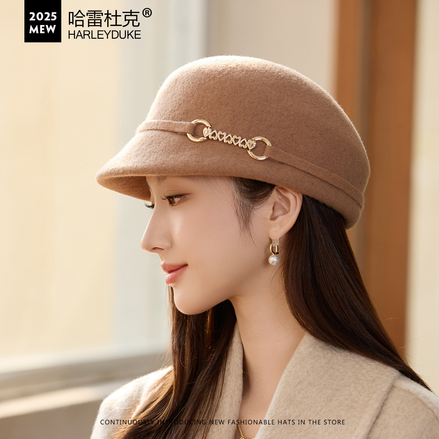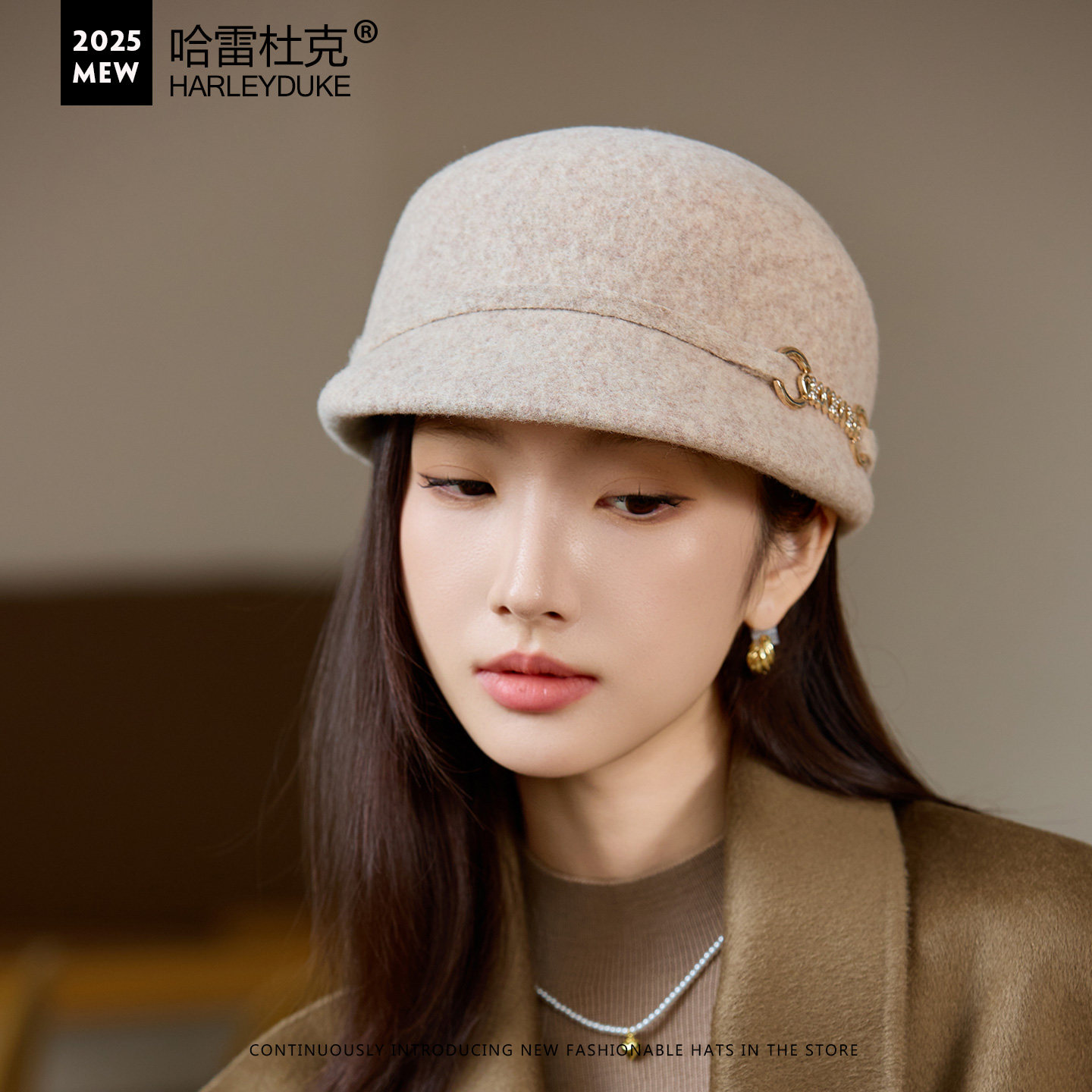 羊毛盆帽礼帽女秋冬毛呢爱心链条渔夫帽马术帽时尚优雅复古显脸小